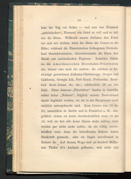 kam der Tag von Sedan — und nun war Niemand„patriotischer“, Niemand von Jubel so voll und so tollwie die Börse. Während unsere Soldaten den Feindvor sich her trieben, trieb die Börse die Course in dieHöhe; während die Französischen Gefangenen Deutsch-land überschwemmten, überschwemmte die Börse denMarkt mit ausländischen Papieren. Zunächst führtesie die Amerikanischen Eisenbahn-Prioritätenein, immer eine nach der andern: die seitdem so be-rüchtigt gewordenen Alabama-Chattanooga, Oregon undCalifornia, Georgia Aid, Port Royal, Peninsular, Rock-ford Rock-Island etc. etc.; schliesslich 26 an derZahl. Diese famosen „Prioritäten“ fanden in Amerika selber keine „Nehmer“, folglich musste Deutschland damit beglückt werden, wo sie in der Hauptsache auchwirklich untergebracht sind. Zum Course von 70 bis90, namentlich in Berlin und in Frankfurt a. M., ein-geführt, stehen sie heute durchschnittlich etwa 10 bis20, weil sie fast alle keine Zinsen mehr zahlen; vielewerden gar nicht mehr notirt, da sie völlig unver-käuflich sind, denn die betreffenden Bahnen habenBankerott gemacht, oder sie liegen unvollendet inRuinen da. Auf diesem Wege sind an hundert Millio-nen Thaler in’s Ausland geflossen, und nicht viel