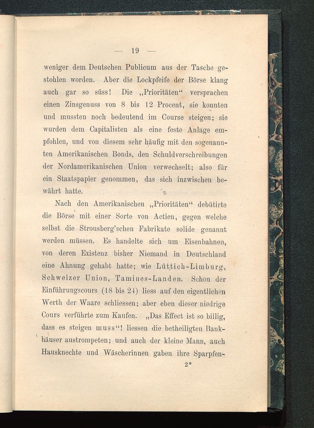 weniger dem Deutschen Publicum aus der Tasche ge-stohlen worden. Aber die Lockpfeife der Börse klangauch gar so süss! Die „Prioritäten“ verspracheneinen Zinsgenuss von 8 bis 12 Procent, sie konntenund mussten noch bedeutend im Course steigen; siewurden dem Capitalisten als eine feste Anlage em-pfohlen, und von diesem sehr häufig mit den sogenann-ten Amerikanischen Bonds, den Schuldverschreibungender Nordamerikanischen Union verwechselt; also fürein Staatspapier genommen, das sich inzwischen be-währt hatte.