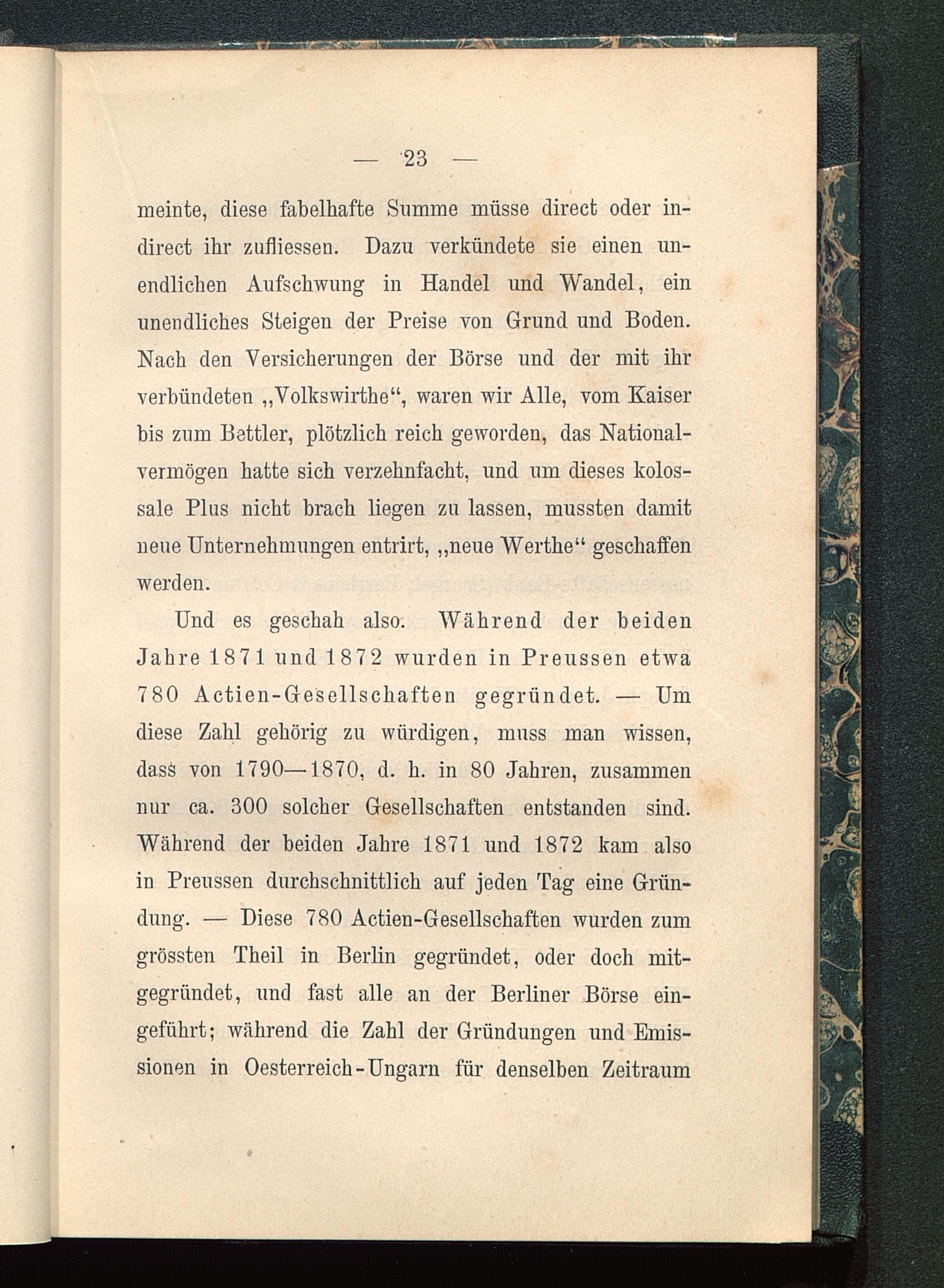 meinte, diese fabelhafte Summe müsse direct oder in-direct ihr zufliessen. Dazu verkündete sie einen un-endlichen Aufschwung in Handel und Wandel, einunendliches Steigen der Preise von Grund und Boden.Nach den Versicherungen der Börse und der mit ihrverbündeten „Volkswirthe“, waren wir Alle, vom Kaiserbis zum Bettler, plötzlich reich geworden, das National-vermögen hatte sich verzehnfacht, und um dieses kolos-sale Plus nicht brach liegen zu lassen, mussten damitneue Unternehmungen entrirt, „neue Werthe“ geschaffenwerden.