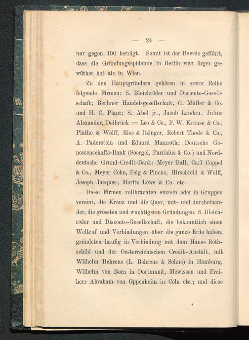 Diese Firmen vollbrachten einzeln oder in Gruppenvereint, die Kreuz und die Quer, mit- und durcheinan-der, die grössten und wichtigsten Gründungen. S. Bleich-röder und Disconto-Gesellschaft, die bekanntlich einenWeltruf und Verbindungen über die ganze Erde haben,gründeten häufig in Verbindung mit dem Hause Roth-schild und der Oesterreichischen Credit-Anstalt, mitWilhelm Behrens (L. Behrens & Söhne) in Hamburg ,Wilhelm von Born in Dortmund , Mewissen und Frei-herr Abraham von Oppenheim in Cöln etc.; und diese
