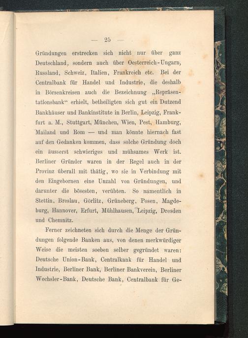 Ferner zeichneten sich durch die Menge der Grün-dungen folgende Banken aus, von denen merkwürdigerWeise die meisten soeben selber gegründet waren:Deutsche Union-Bank, Centralkank für Handel undIndustrie, Berliner Bank, Berliner Bankverein, BerlinerWechsler-Bank, Deutsche Bank, Centralbank für Ge-