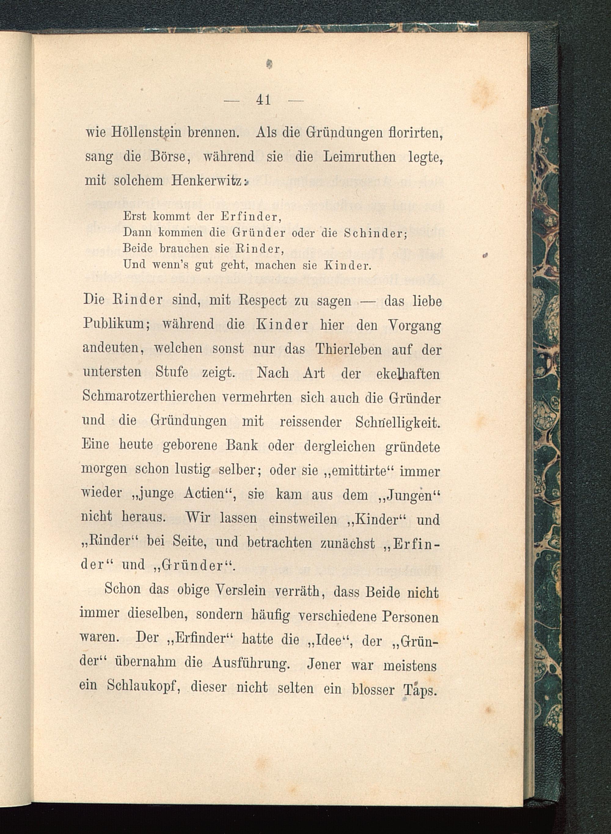 Die Hin der sind, mit Respect zu sagen — das liebePublikum; während die Kinder hier den Vorgangandeuten, welchen sonst nur das Thierleben auf deruntersten Stufe zeigt. Nach Art der ekelhaftenSchmarotzerthierchen vermehrten sich auch die Gründerund die Gründungen mit reissender Schnelligkeit.Eine heute geborene Bank oder dergleichen gründetemorgen schon lustig selber; oder sie „emittirte“ immerwieder „junge Actien“, sie kam aus dem „Jungen“nicht heraus. Wir lassen einstweilen „Kinder“ und„Rinder“ bei Seite, und betrachten zunächst „Erfin-der“ und „Gründer“.