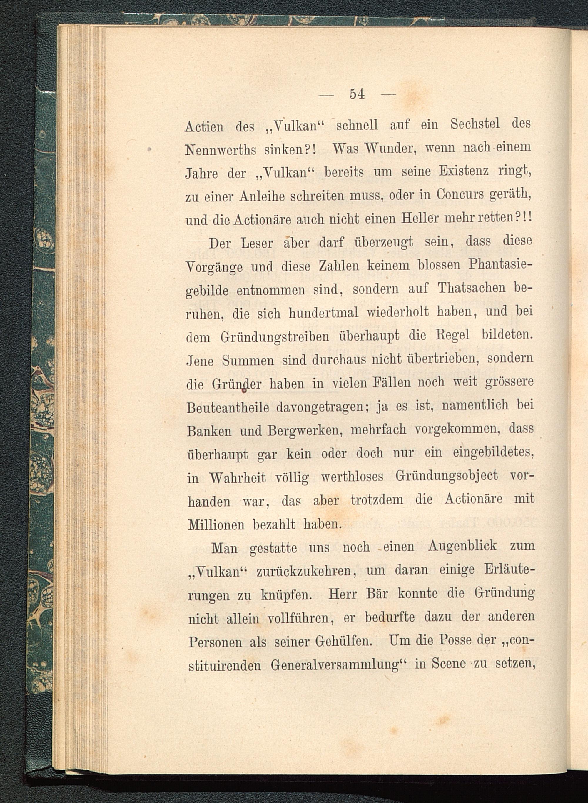 Actien des „Vulkan“ schnell auf ein Sechstel desNennwerths sinken?! Was Wunder, wenn nach einemJahre der „Vulkan“ bereits um seine Existenz ringt,zu einer Anleihe schreiten muss, oder in Concurs geräth,und die Actionäre auch nicht einen Heller mehr retten ?!!