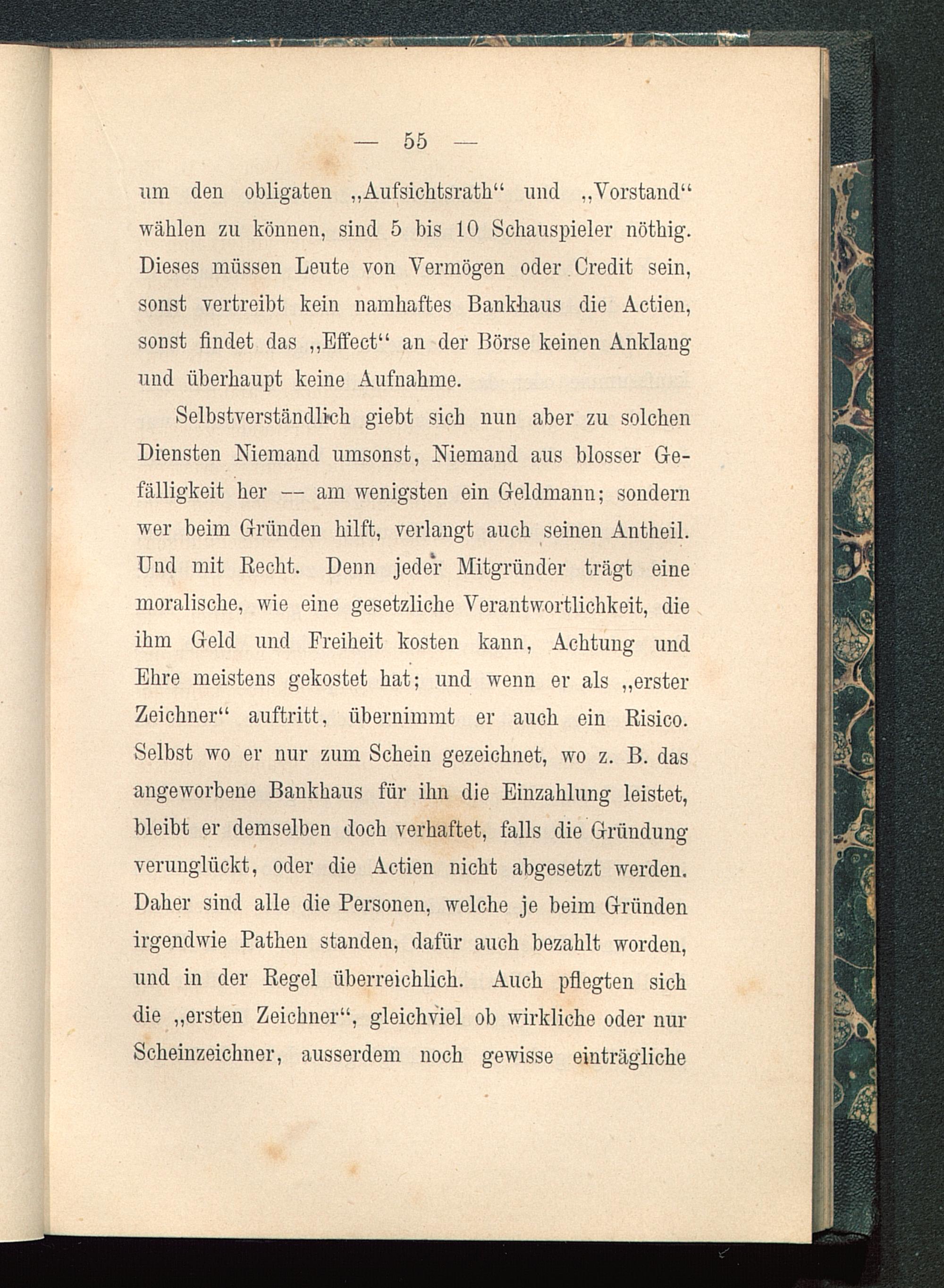 um den obligaten „Aufsichtsrath“ und „Vorstand “wählen zu können, sind 5 bis 10 Schauspieler nöthig.Dieses müssen Leute von Vermögen oder Credit sein,sonst vertreibt kein namhaftes Bankhaus die Actien,sonst findet das „Effect“ an der Börse keinen Anklaugund überhaupt keine Aufnahme.