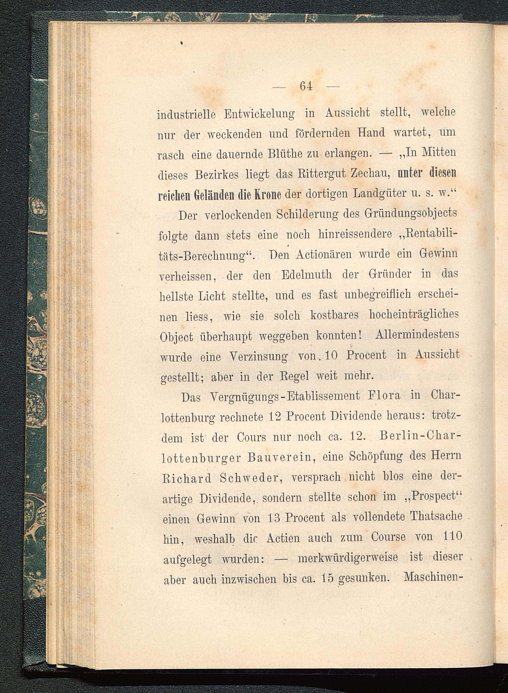 Der verlockenden Schilderung des Gründungsobjectsfolgte dann stets eine noch hinreissendere „Rentabili-täts-Berechnung“. Den Actionären wurde ein Gewinnverheissen, der den Edelmuth der Gründer in dashellste Licht stellte, und es fast unbegreiflich erschei-nen liess, wie sie solch kostbares hocheinträglichesObject überhaupt Weggehen konnten! Allermindestenswurde eine Verzinsung von. 10 Procent in Aussichtgestellt; aber in der Regel weit mehr.