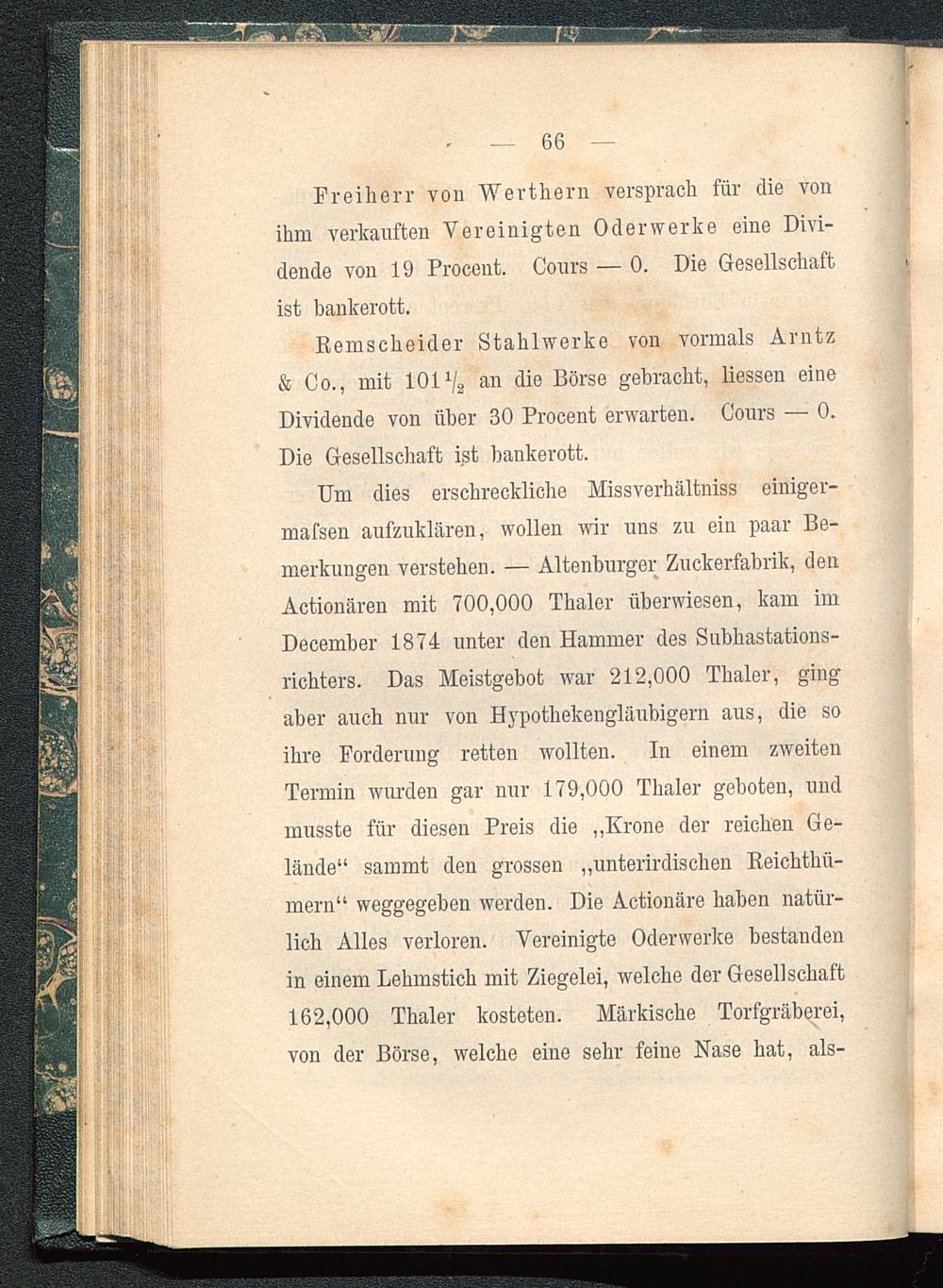 Um dies erschreckliche Missverhältniss einiger-mafsen aufzuklären, wollen wir uns zu ein paar Be-merkungen verstehen. — Altenburger Zuckerfabrik, denActionären mit 700,000 Thaler überwiesen, kam imDecember 1874 unter den Hammer des Subhastations-richters. Das Meistgebot war 212,000 Thaler, gingaber auch nur von Hypothekengläubigern aus, die soihre Forderung retten wollten. In einem zweitenTermin wurden gar nur 179,000 Thaler geboten, undmusste für diesen Preis die „Krone der reichen Ge-lände“ sammt den grossen „unterirdischen Reichthii-mern“ weggegeben werden. Die Actionäre haben natür-lich Alles verloren. Vereinigte Oder werke bestandenin einem Lehmstich mit Ziegelei, welche der Gesellschaft162,000 Thaler kosteten. Märkische Torfgräberei,von der Börse, welche eine sehr feine Nase hat, als-