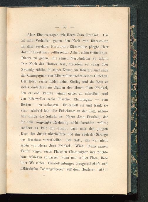 Aber Eins verargen wir Herrn Jean Frankel. Dasist sein Verhalten gegen den Koch von Ritzewoller.In dem koscbern Restaurant Ritzewoller pflegte HerrJean Frankel nach vollbrachter Arbeit seine Gründungs-Diners zu geben, mit seinen Verbündeten zu tafeln.Der Koch des Hauses war, trotzdem er wenig überZwanzig zählte, in seiner Kunst ein Meister; und auchder Champagner von Ritzewoller suchte seines Gleichen.Der Koch verlor leider seine Stelle, und da liess ersich’s einfallen, im Namen des Herrn Jean Frankel,den er wohl kannte, einen Zettel zu schreiben undvon Ritzewoller sechs Flaschen Champagner — vomBesten — zu verlangen. Er erhielt sie und trank sieaus. Alsbald kam die Fälschung an den Tag; natür-lich durch die Schuld des Herrn Jean Frankel, derdie ihm vorgelegte Rechnung nicht bezahlen wollte;sondern es kalt mit ansah, dass man den jungenKoch der Justiz überlieferte und ihn nach der Strengedes Gesetzes verurtheilte. Bei Gott, das war nichtschön von Herrn Jean Frankel! Wie? Einen armenTeufel wegen sechs Flaschen Champagner in’s Zucht-haus schicken zu lassen, wenn man selber Flora, Ber-liner Weissbier, Charlottenburger Baugesellschaft und„Märkische Todtengräberei“ auf dem Gewissen hat?!