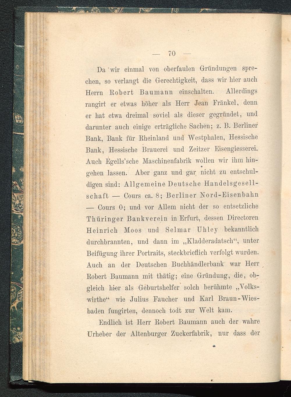 Da 'wir einmal von oberfaulen Gründungen spre-chen, so verlangt die Gerechtigkeit, dass wir hier auchHerrn Robert Baumann einschalten. Allerdingsrangirt er etwas höher als Herr Jean Frankel, denner hat etwa dreimal soviel als dieser gegründet, unddarunter auch einige erträgliche Sachen; z. B. BerlinerBank, Bank für Rheinland und Westphalen, HessischeBank, Hessische Brauerei und Zeitzer Eisengiesserei.Auch Egells ’sche Maschinenfabrik wollen wir ihm hin-gehen lassen. Aber ganz und gar nicht zu entschul-digen sind: Allgemeine Deutsche Handelsgesell-schaft — Cours ca. 8; Berliner Nord-Eisenbahn— Cours 0; und vor Allem nicht der so entsetzlicheThüringer Bankverein in Erfurt , dessen DirectorenHeinrich Moos und Selmar Uhley bekanntlichdurchbrannten, und dann im „Kladderadatsch“, unterBeifügung ihrer Portraits, steckbrieflich verfolgt wurden.Auch an der Deutschen Buchhändlerbank war HerrRobert Baumann mit thätig; eine Gründung, die, ob-gleich hier als Geburtshelfer solch berühmte „Volks-wirthe“ wie Julius Faucher und Karl Braun-Wies-baden fungirten, dennoch todt zur Welt kam.