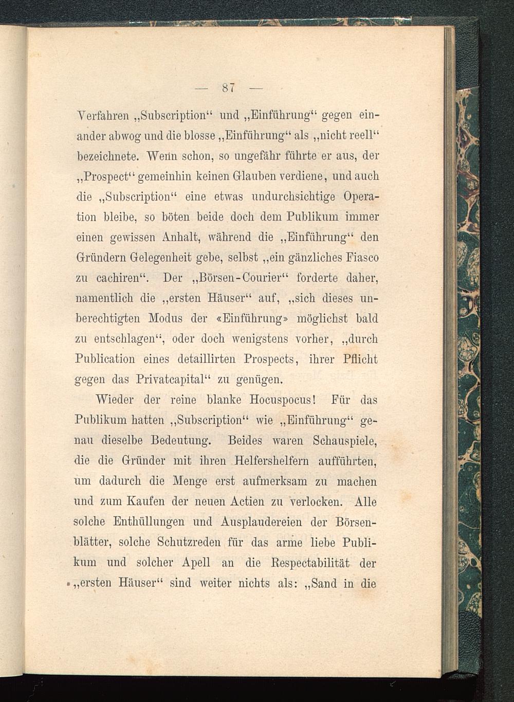 Wieder der reine blanke Hocuspocus! Für dasPublikum hatten „Subscription“ wie „Einführung“ ge-nau dieselbe Bedeutung. Beides waren Schauspiele,die die Gründer mit ihren Helfershelfern aufführten,um dadurch die Menge erst aufmerksam zu machenund zum Kaufen der neuen Actien zu verlocken. Allesolche Enthüllungen und Ausplaudereien der Börsen-blätter, solche Schutzreden für das arme liebe Publi-kum und solcher Apell an die ßespectabilität der• „ersten Häuser“ sind weiter nichts als: „Sand in die