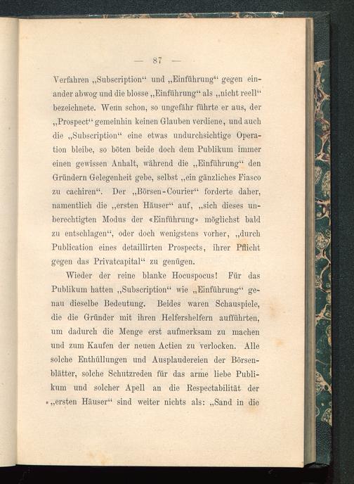 Verfahren „Subscription“ und „Einführung“ gegen ein-ander abwog und die blosse „Einführung“ als „nicht reell“bezeichnete. Weiln schon, so ungefähr führte er aus, der„Prospect“ gemeinhin keinen Glauben verdiene, und auchdie „Subscription“ eine etwas undurchsichtige Opera-tion bleibe, so böten beide doch dem Publikum immereinen gewissen Anhalt, während die „Einführung“ denGründern Gelegenheit gebe, selbst „ein gänzliches Fiascozu cachiren“. Der „Börsen-Courier“ forderte daher,namentlich die „ersten Häuser“ auf, „sich dieses un-berechtigten Modus der «Einführung» möglichst baldzu entschlagen“, oder doch wenigstens vorher, „durchPublication eines detaillirten Prospects, ihrer Pflichtgegen das Privatcapital“ zu genügen.