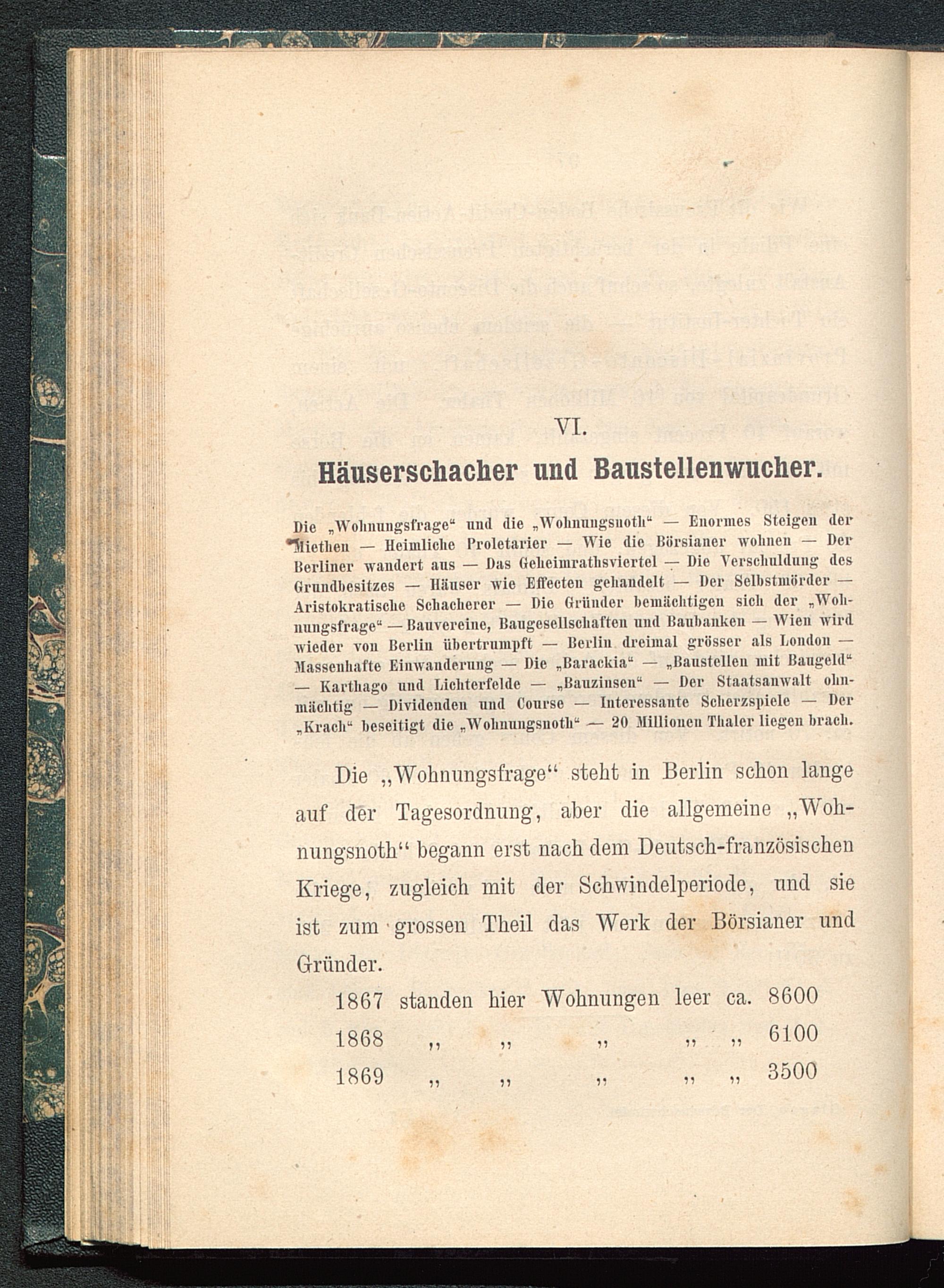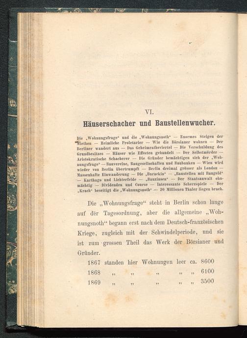Die „Wohnungsfrage“ und die „Wohnnngsuotli“ — Enormes Steigen der•Ülietlien — Heimliche Proletarier — Wie die iiörsianer wohnen — DerBerliner wandert ans — Das (ielicimratlisviertel — Die Verschuldung desGrundbesitzes — Häuser wie Effecten gehandelt — Der Selbstmörder —Aristokratische Schacherer — Die Gründer bemächtigen sich der „Woh-nungsfrage“ — ßauvercine, Baugesellschaften und Banhanken — Wien wirdwieder von Berlin übertrumpft — Berlin dreimal grösser als London —Massenhafte Einwanderung — Die „Barackia“ — „Baustellen mit Baugeld“— Karthago und Mchtcrfelde — „Bauzinsen“ — Der Staatsanwalt ohn-mächtig — Dividenden und Conrse — Interessante Scherzspiele — Der„Krach“ beseitigt die „Wolmungsuoth“ — 20 Millionen Tlinler liegen brach.