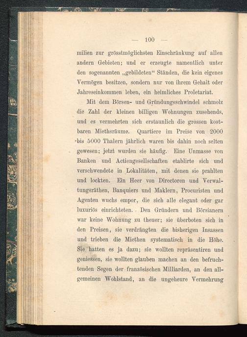 Mit dem Börsen- und Gründungsschwindel schmolzdie Zahl der kleinen billigen Wohnungen zusehends,und es vermehrten sich erstaunlich die grossen kost-baren Miethsräume. Quartiere im Preise von 2000»bis 5000 Thalern jährlich waren bis dahin noch seltengewesen; jetzt wurden sie häufig. Eine Unmasse vonBanken und Actiengesellschaften etablirte sich undverschwendete in Lokalitäten, mit denen sie prahltenund lockten. Ein Heer von Directoren und Verwal-tungsräthen, Banquiers und Maklern, Procuristen undAgenten wuchs empor, die sich alle elegant oder garluxuriös einrichteten. Den Gründern und Börsianernwar keine Wohnung zu theuer; sie überboten sich inden Preisen, sie verdrängten die bisherigen Insassenund trieben die Miethen systematisch in die Höhe.Sie hatten es ja dazu; sie wollten repräsentiren undgemessen, sie wollten glauben machen an den befruch-tenden Segen der französischen Milliarden, an den all-gemeinen Wohlstand, an die ungeheure Vermehrung