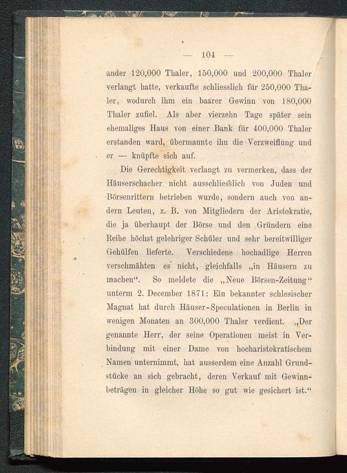 Die Gerechtigkeit verlangt zu vermerken, dass derHäuserschacher nicht ausschliesslich von Juden und•Börsenrittern betrieben wurde, sondern auch von an-dern Leuten, z. B. von Mitgliedern der Aristokratie,die ja überhaupt der Börse und den Gründern eineReihe höchst gelehriger Schüler und sehr bereitwilligerGehülfen lieferte. Verschiedene hochadlige Herrenverschmähten es nicht, gleichfalls „in Häusern zumachen“. So meldete die „Neue Börsen-Zeitung“unterm 2. December 1871: Ein bekannter schlesischerMagnat hat durch Häuser-Speculationen in Berlin inwenigen Monaten an 300,000 Thaler verdient. „Dergenannte Herr, der seine Operationen meist in Ver-bindung mit einer Dame von hocharistokratischemNamen unternimmt, hat ausserdem eine Anzahl Grund-stücke an sich gebracht, deren Verkauf mit Gewinn-beträgen in gleicher Höhe so gut wie gesichert ist.“