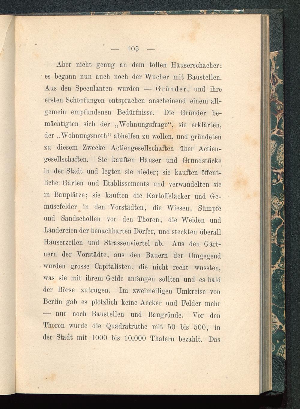 Aber nicht genug an dem tollen Häuserschacher:es begann nun auch noch der Wucher mit Baustellen.Aus den Speculanten wurden — Gründer, und ihreersten Schöpfungen entsprachen anscheinend einem all-gemein empfundenen Bedürfnisse. Die Gründer be-mächtigten sich der „Wohnungsfrage“, sie erklärten,der „Wohnungsnoth“ abhelfen zu wollen, und gründetenzu diesem Zwecke Actiengesellschaften über Actien-gesellschaften. Sie kauften Häuser und Grundstückein der Stadt und legten sie nieder; sie kauften öffent-liche Gärten und Etablissements und verwandelten siein Bauplätze; sie kauften die Kartoffeläcker und Ge-müsefelder in den Vorstädten, die Wiesen, Sümpfeund Sandschollen vor den Thoren, die Weiden undLändereien der benachbarten Dörfer, und steckten überallHäuserzeilen und Strassenviertel ab. Aus den Gärt-nern der Vorstädte, aus den Bauern der Umgegendwurden grosse Capitalisten, die nicht recht wussten,was sie mit ihrem Gelde anfangen sollten und es baldder Börse zutrugen. Im zweimeiligen Umkreise vonBerlin gab es plötzlich keine Aecker und Felder mehr— nur noch Baustellen und Baugründe. Vor denThoren wurde die Quadratruthe mit 50 bis 500, inder Stadt mit 1000 bis 10,000 Thalern bezahlt. Das