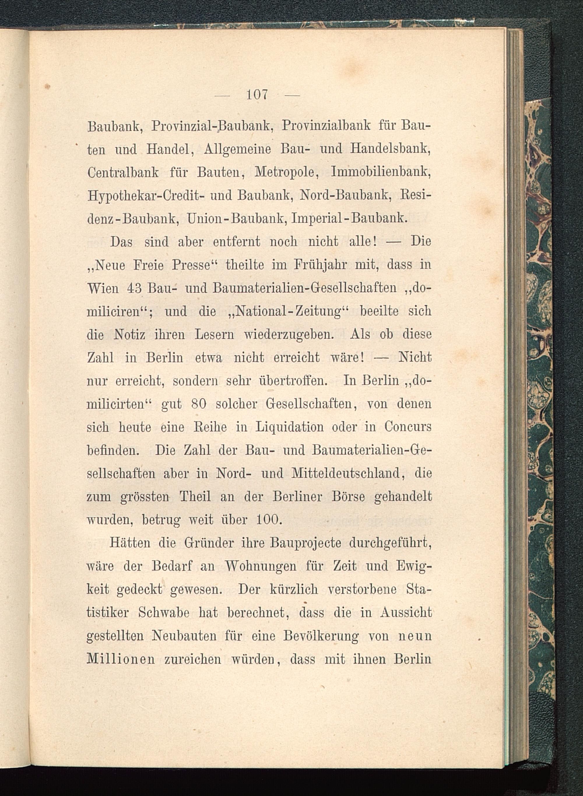 Hätten die Gründer ihre Bauprojecte durchgeführt,wäre der Bedarf an Wohnungen für Zeit und Ewig-keit gedeckt gewesen. Der kürzlich verstorbene Sta-tistiker Schwabe hat berechnet, dass die in Aussichtgestellten Neubauten für eine Bevölkerung von neunMillionen zureichen würden, dass mit ihnen Berlin