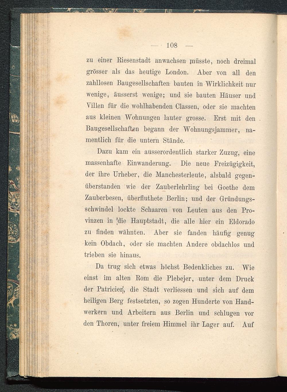 Dazu kam ein ausserordentlich starker Zuzug, einemassenhafte Einwanderung. Die neue Freizügigkeit,der ihre Urheber, die Manchesterleute, alsbald gegen-überstanden wie der Zauberlehrling bei Goethe demZauberbesen, überfluthete Berlin ; und der Gründungs-schwindel lockte Schaaren von Leuten aus den Pro-vinzen in 'die Hauptstadt, die alle hier ein Eldoradozu finden wähnten. Aber sie fanden häufig genugkein Obdach, oder sie machten Andere obdachlos undtrieben sie hinaus.