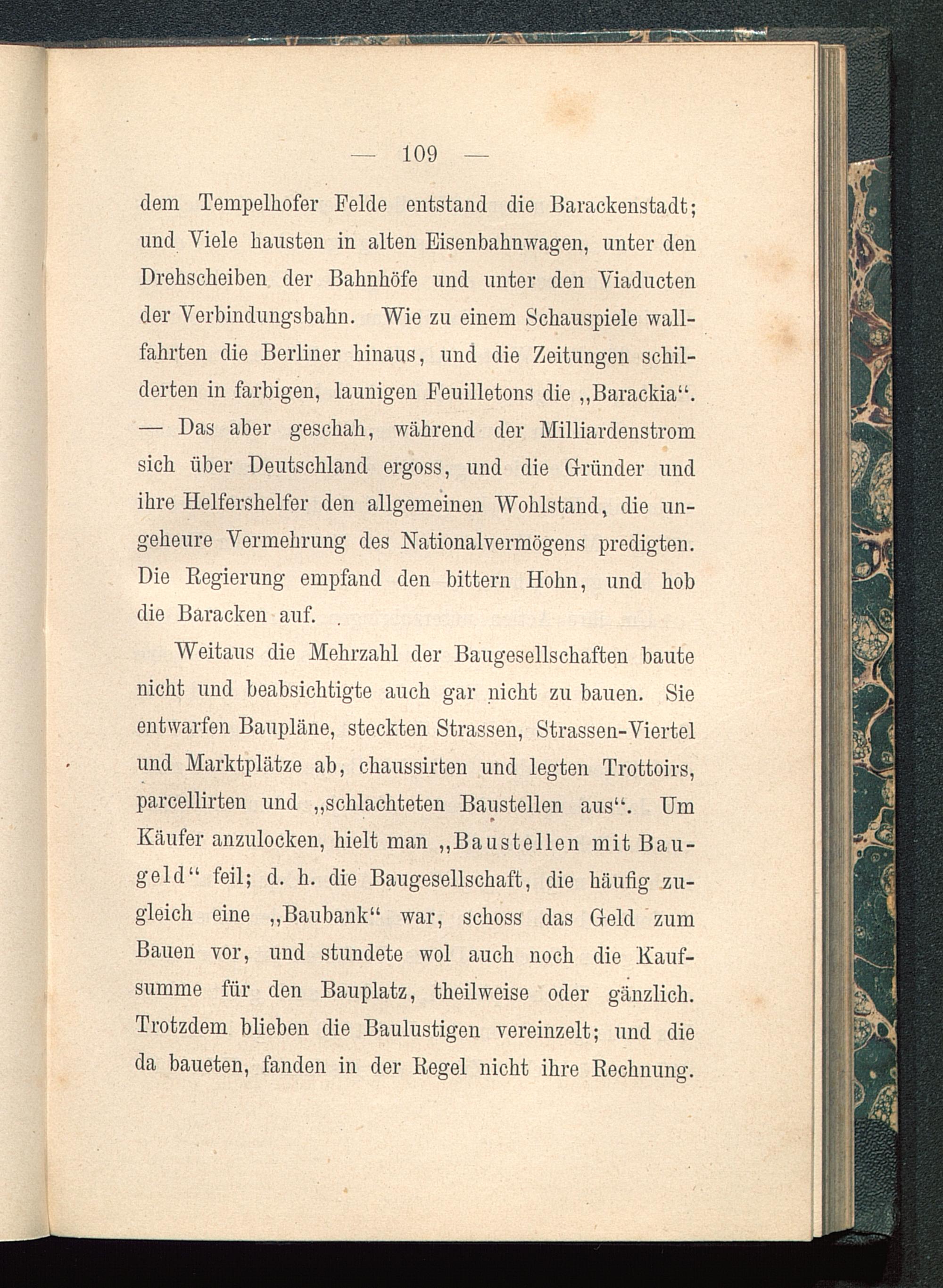 dem Tempelhofer Felde entstand die Barackenstadt;und Viele hausten in alten Eisenbahnwagen, unter denDrehscheiben der Bahnhöfe und unter den Viaductender Verbindungsbahn. Wie zu einem Schauspiele wall-fahrten die Berliner hinaus, und die Zeitungen schil-derten in farbigen, launigen Feuilletons die „Barackia“.— Das aber geschah, während der Milliardenstromsich über Deutschland ergoss, und die Gründer undihre Helfershelfer den allgemeinen Wohlstand, die un-geheure Vermehrung des Nationalvermögens predigten.Die Regierung empfand den bittern Hohn, und hobdie Baracken auf.