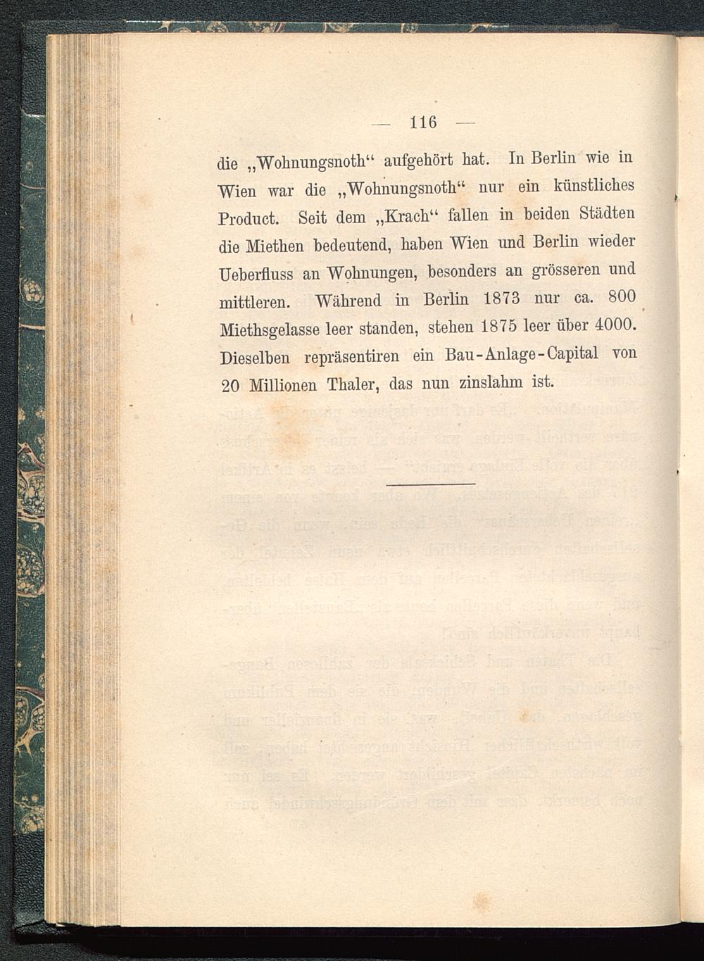 die „Woknungsnoth“ aufgekört kat. In Berlin wie inWien war die „Woknungsnotk“ nur ein künstlickesProduct. Seit dem „Krack“ fallen in keiden Städtendie Mietken bedeutend, kaben Wien und Berlin wiederUeberfluss an Wohnungen, besonders an grösseren undmittleren. Während in Berlin 1873 nur ca. 800Miethsgelasse leer standen, stehen 1875 leer über 4000.Dieselben repräsentiren ein Bau-Anlage-Capital von20 Millionen Tkaler, das nun zinslahm ist.