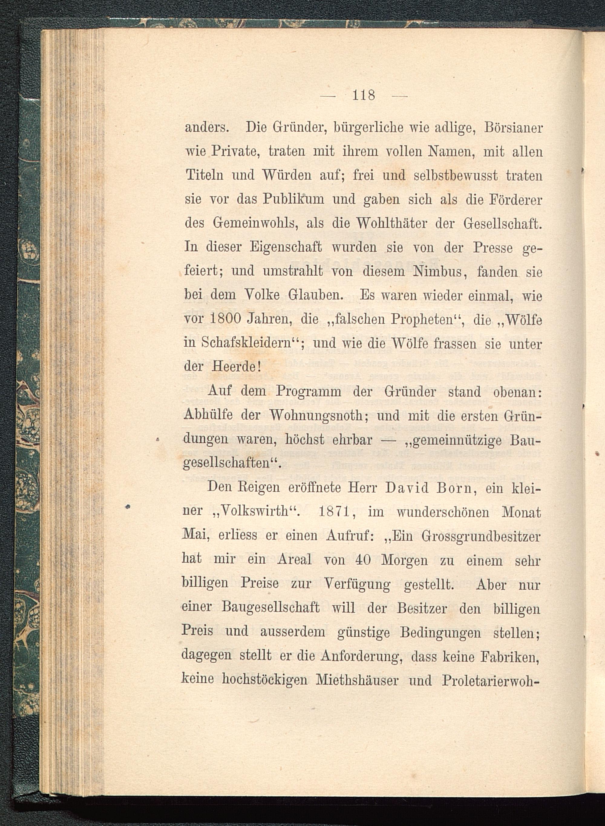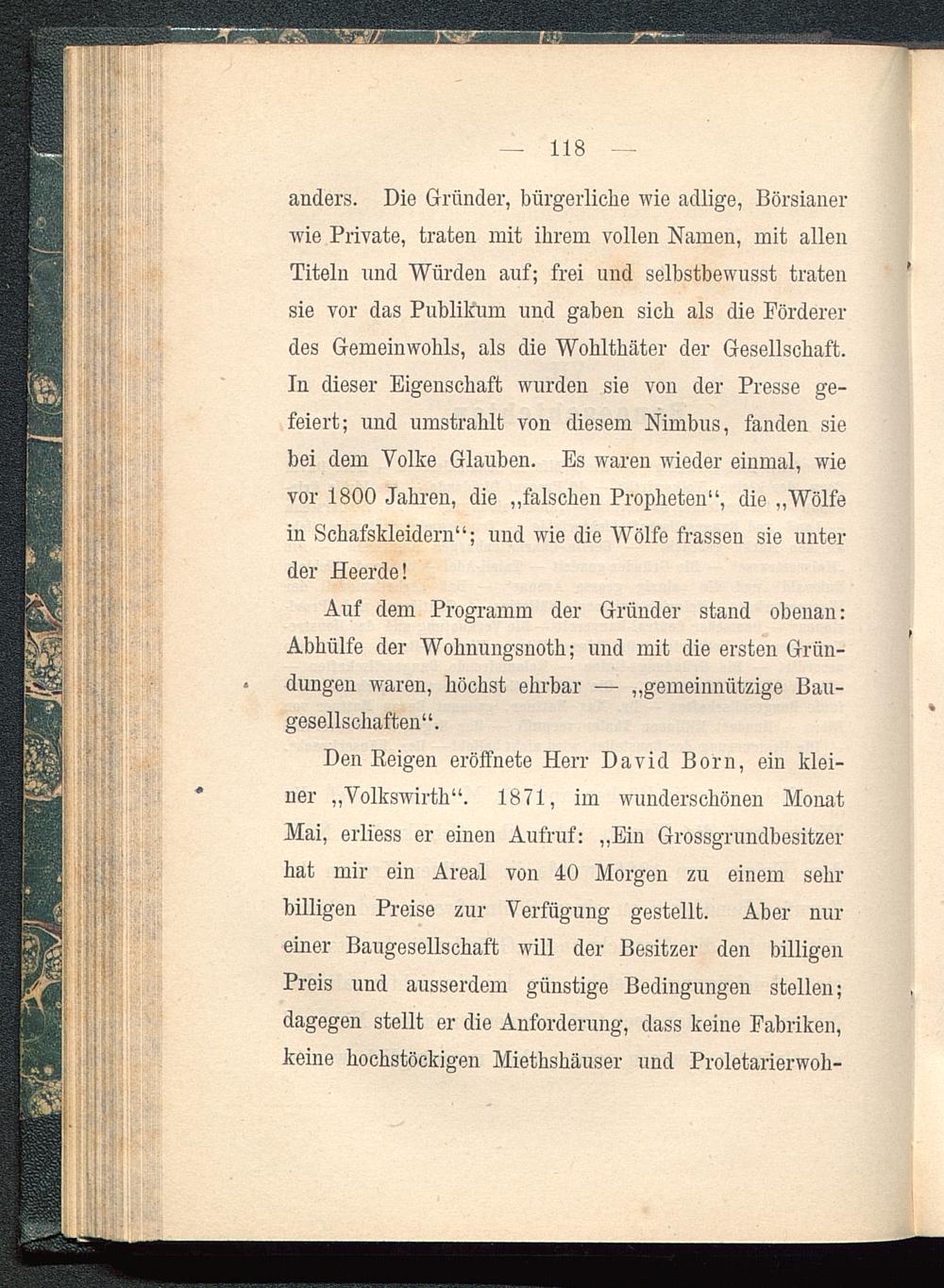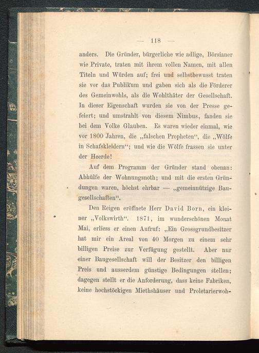 Den Reigen eröffnete Herr David Born, ein klei-ner „Volkswirth“. 1871, im wunderschönen MonatMai, erliess er einen Aufruf: „Ein Grossgrundbesitzerhat mir ein Areal von 40 Morgen zu einem sehrbilligen Preise zur Verfügung gestellt. Aber nureiner Baugesellschaft will der Besitzer den billigenPreis und ausserdem günstige Bedingungen stellen;dagegen stellt er die Anforderung, dass keine Fabriken,keine hochstöckigen Mietshäuser und Proletarierwoh-