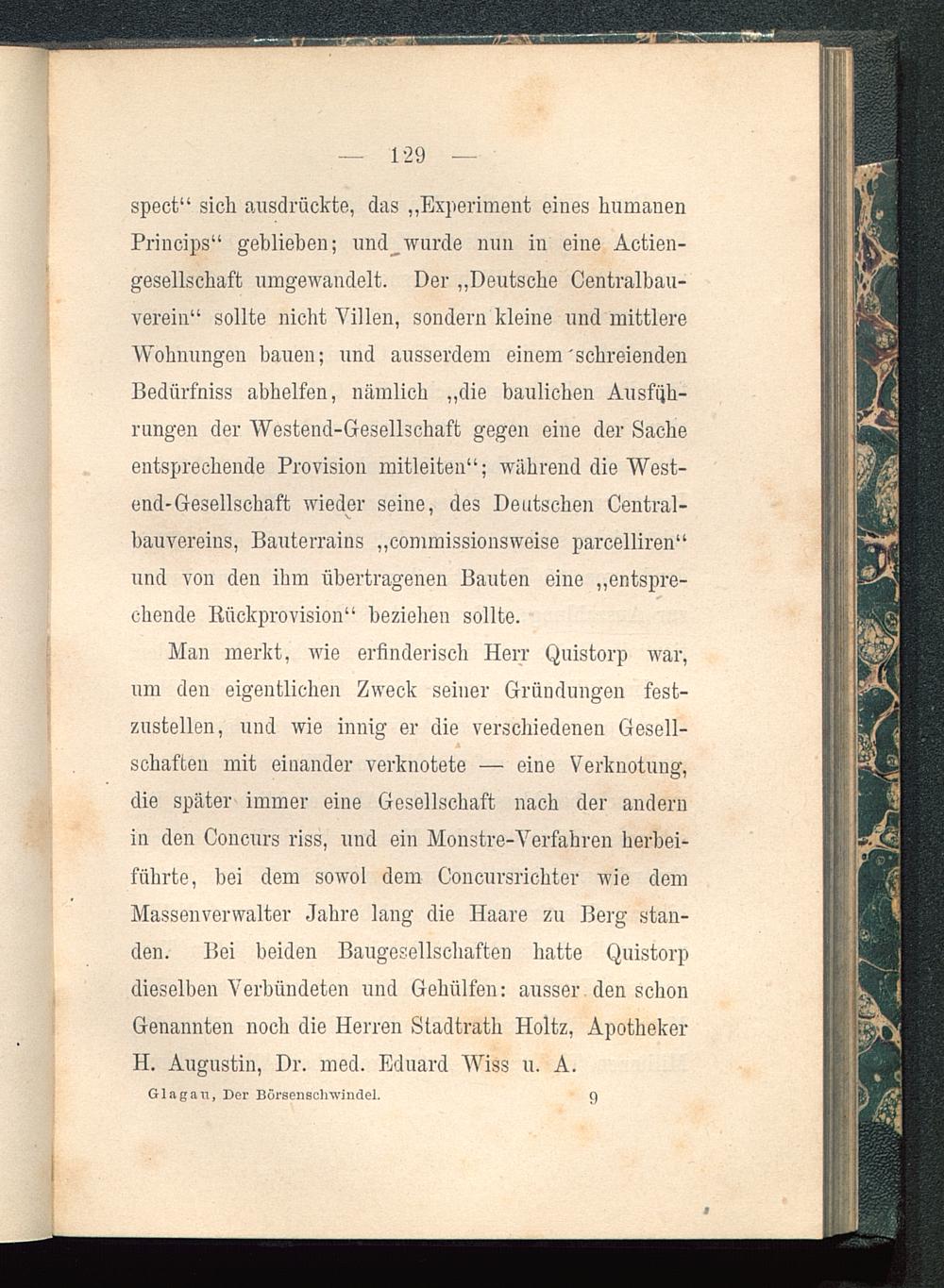 Man merkt, wie erfinderisch Herr Quistorp war,um den eigentlichen Zweck seiner Gründungen fest-zustellen, und wie innig er die verschiedenen Gesell-schaften mit einander verknotete — eine Verknotung,die später immer eine Gesellschaft nach der andernin den Concurs riss, und ein Monstre-Verfahren herbei-führte, bei dem sowol dem Concursrichter wie demMassenverwalter Jahre lang die Haare zu Berg stan-den. Bei beiden Baugesellschaften hatte Quistorpdieselben Verbündeten und Gehülfen: ausser den schonGenannten noch die Herren Stadtrath Holtz, ApothekerH. Augustin, Dr. med. Eduard Wiss u. A.