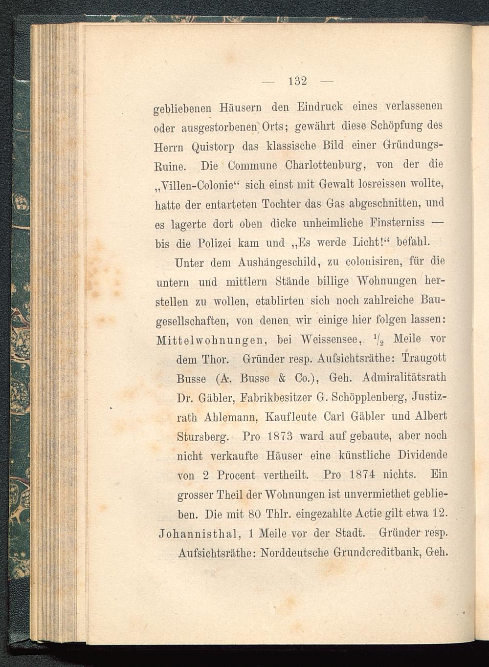 Unter dem Aushängeschild, zu colonisiren, für dieuntern und mittlern Stände billige Wohnungen her-steilen zu wollen, etablirten sich noch zahlreiche Bau-gesellschaften, von denen wir einige hier folgen lassen:Mittelwohnungen, bei Weissensee, 1 j 2 Meile vordem Thor. Gründer resp. Aufsichtsräthe: TraugottBusse (A-. Busse & Co.), Geh. AdmiralitätsrathDr. Gäbler, Fabrikbesitzer G. Schöpplenberg, Justiz-rath Ahlemann, Kaufleute Carl Gäbler und AlbertStursberg. Pro 1873 ward auf gebaute, aber nochnicht verkaufte Häuser eine künstliche Dividendevon 2 Procent vertheilt. Pro 1874 nichts. Eingrosser Theil der Wohnungen ist unvermiethet geblie-ben. Die mit 80 Thlr. eingezahlte Actie gilt etwa 12.Johannisthal, 1 Meile vor der Stadt. Gründer resp.Aufsichtsräthe: Norddeutsche Grundcreditbank, Geh.