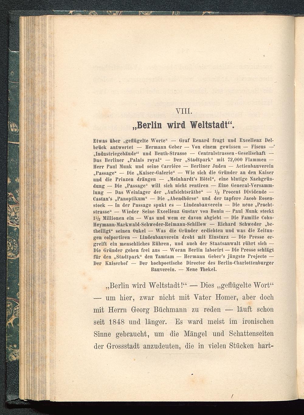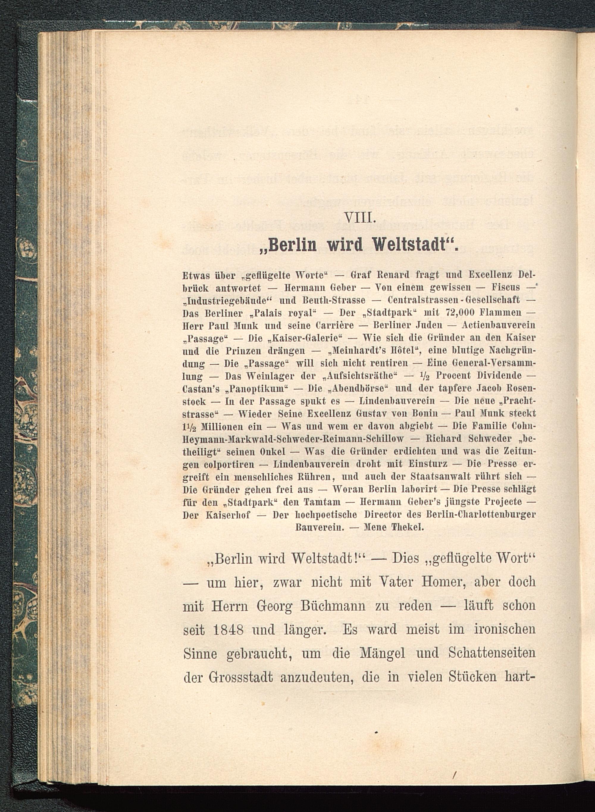 Etwas über „geflügelte Worte“ — Graf Renard fragt und Excellenz Del-brück antwortet — Hermann Geber — Von einem gewissen — Eisens —'„Industriegebäude“ und Benth-Strasse — Centralstrassen - Gesellschaft —Das Berliner „Palais royal“ — Der „Stadtpark“ mit 72,000 Flammen —Herr Pani Munk und seine Barriere — Berliner Juden — Actienbanvercin„Passage“ — Die „Kaiser-Galerie“ — Wie sieli die Gründer an den Kaiserund die Prinzen drängen — „Meinliardt’s Hotel“, eine blntige Nachgriin-dung — Die „Passage“ will sich nicht reutiren — Eine General-Versamm-lung — Das Weinlager der „Aufsichtsräthc“ — 1/2 Procent Dividende —Oastan’s „Panoptikum“ — Die „Abendbörse“ und der tapfere Jacob Rosen-stock — In der Passage spukt cs — Lindenbauverein — Die neue „Pracht-strasse“ — Wieder Seine Excellenz Gustav von Bonin — Paul Mnnk steckt11/2 Millionen ein — Was uml wem er davon abgiebt — Die Familie Oohn-Heymanu-Markwald-Schwcder-Reimanu-Scliillow — Richard Schweder „be-theiligt“ seinen Onkel — Was die Gründer erdichten und was die Zeitun-gen colportiren — Lindenbauverein droht mit Einsturz — Die Presse er-greift ein menschliches Rühren, und auch der Staatsanwalt rührt sich —Die Gründer gehen frei ans — Woran Berlin laliorirt — Die Presse schlägtfür den „Stadtpark“ den Tamtam — Hermann Gcber’s jüngste Projecte —Der Kaiserhof — Der hochpoetische Director des Berlin-Charlottenburger Banverein. — Mene Thekel.