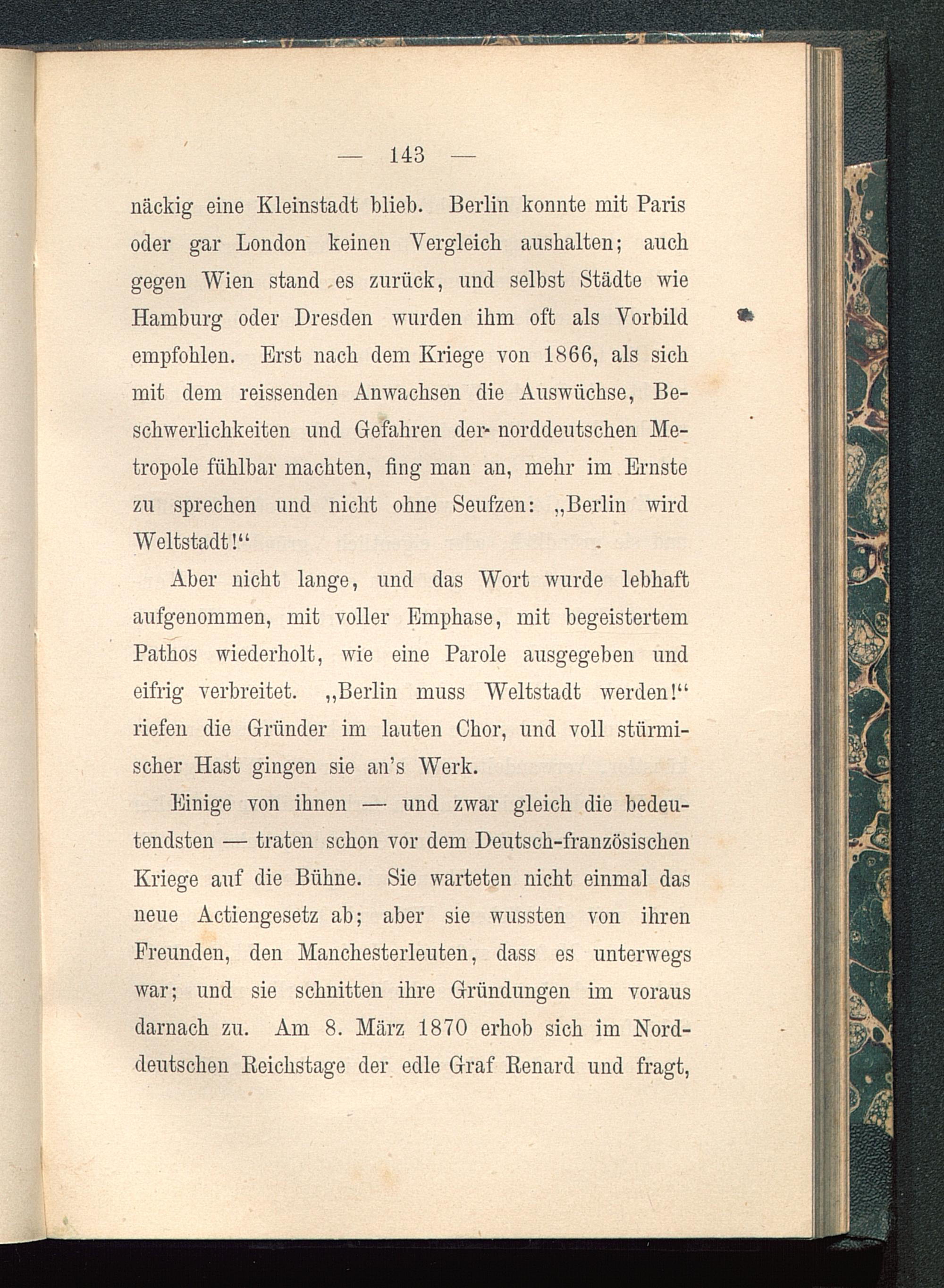 Aber nicht lange, und das Wort wurde lebhaftaufgenommen, mit voller Emphase, mit begeistertemPathos wiederholt, wie eine Parole ausgegeben undeifrig verbreitet. „Berlin muss Weltstadt werden!“riefen die Gründer im lauten Chor, und voll stürmi-scher Hast gingen sie an’s Werk.