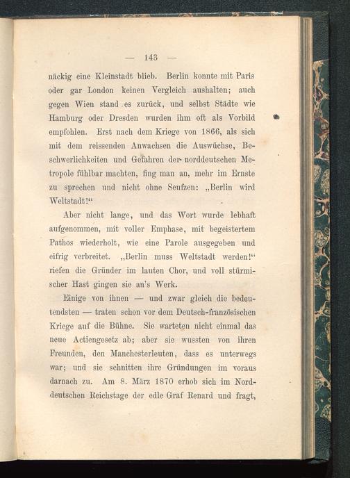 Einige von ihnen — und zwar gleich die bedeu-tendsten — traten schon vor dem Deutsch -französischenKriege auf die Bühne. Sie warteten nicht einmal dasneue Actiengesetz ab; aber sie wussten von ihrenFreunden, den Manchesterleuten, dass es unterwegswar; und sie schnitten ihre Gründungen im vorausdarnach zu. Am 8. März 1870 erhob sich im Nord-deutschen Reichstage der edle Graf Renard und fragt,