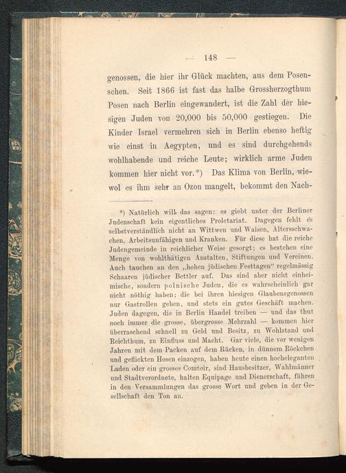 genossen, die hier ihr Glück machten, aus dem Posen-schen. Seit 1866 ist fast das halbe GrossherzogthumPosen nach Berlin eingewandert, ist die Zahl der hie-sigen Juden von 20,000 bis 50,000 gestiegen. DieKinder Israel vermehren sich in Berlin ebenso heftigwie einst in Aegypten , und es sind durchgehendswohlhabende und reiche Leute; wirklich arme Judenkommen hier nicht vor. *) Das Klima von Berlin , wie-wol es ihm sehr an Ozon mangelt, bekommt den Nach-