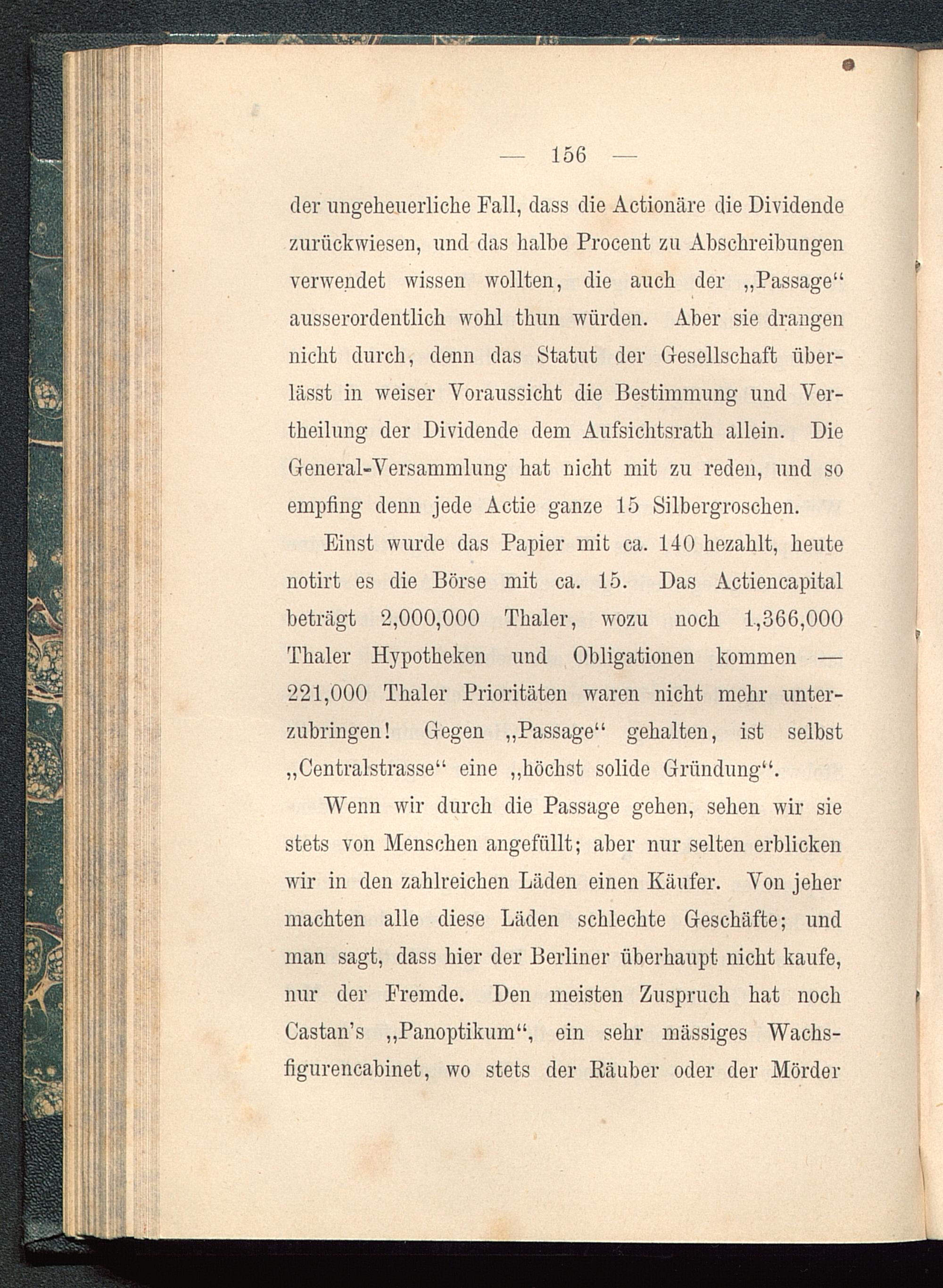 Wenn wir durch die Passage gehen, sehen wir siestets von Menschen angefüllt; aber nur selten erblickenwir in den zahlreichen Läden einen Käufer. Von jehermachten alle diese Läden schlechte Geschäfte; undman sagt, dass hier der Berliner überhaupt nicht kaufe,nur der Fremde. Den meisten Zuspruch hat nochCastan’s „Panoptikum“, ein sehr mässiges Wachs-figurencabinet, wo stets der Käuber oder der Mörder