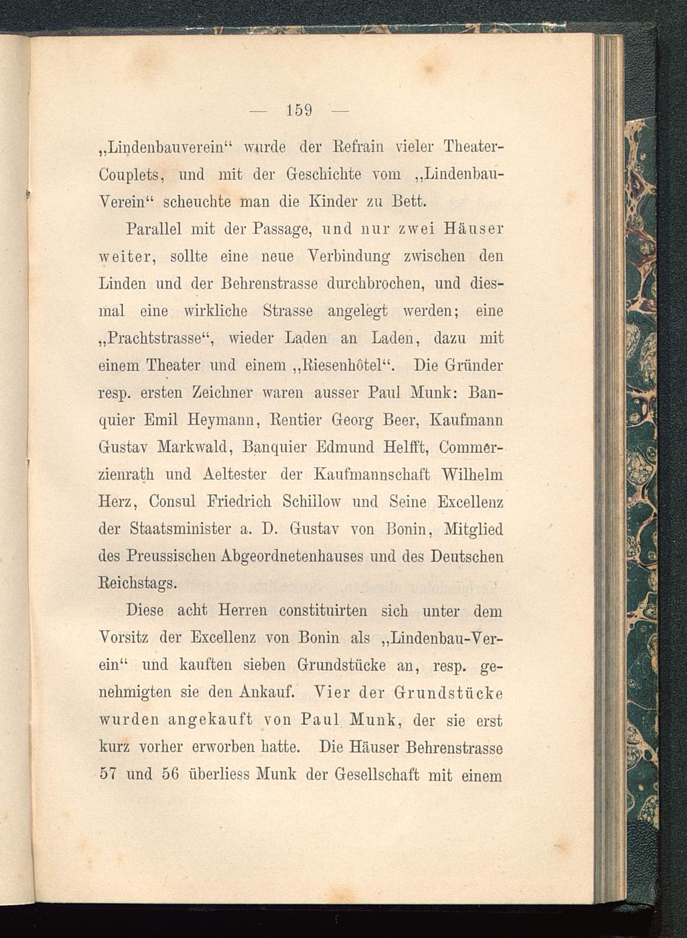 Diese acht Herren constituirten sich unter demVorsitz der Excellenz von Bonin als „Lindenbau-Ver-ein“ und kauften sieben Grundstücke an, resp. ge-nehmigten sie den Ankauf. Vier der Grundstückewurden angekauft von Paul Munk, der sie erstkurz vorher erworben hatte. Die Häuser Behrenstrasse57 und 56 überliess Munk der Gesellschaft mit einem