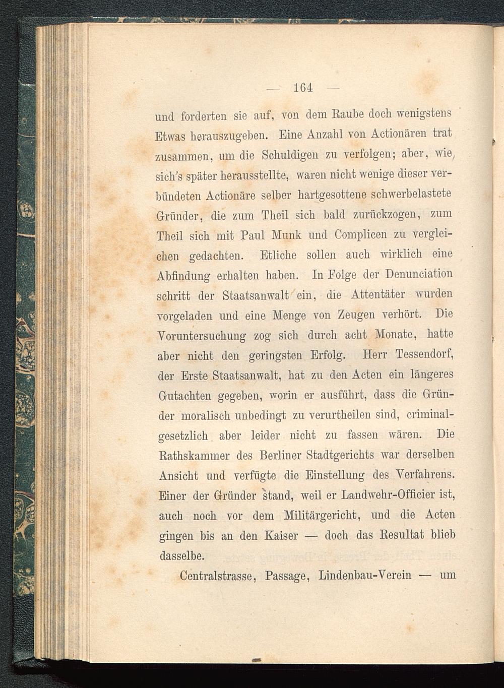 und forderten sie auf, von dem Raube doch wenigstensEtwas herauszugeben. Eine Anzahl von Actionären tratzusammen, um die Schuldigen zu verfolgen; aber, wie,sich’s später herausstellte, waren nicht wenige dieser ver-bündeten Actionäre selber hartgesottene schwerbelasteteGründer, die zum Theil sich bald zurückzogen, zumTheil sich mit Paul Munk und Complicen zu verglei-chen gedachten. Etliche sollen auch wirklich eineAbfindung erhalten haben. In Folge der Denunciationschritt der Staatsanwalt ein, die Attentäter wurdenvorgeladen und eine Menge von Zeugen verhört. DieVoruntersuchung zog sich durch acht Monate, hatteaber nicht den geringsten Erfolg. Herr Tessendorf,der Erste Staatsanwalt, hat zu den Acten ein längeresGutachten gegeben, worin er ausführt, dass die Grün-der moralisch unbedingt zu verurtheilen sind, criminal-gesetzlich aber leider nicht zu fassen wären. DieRathskammer des Berliner Stadtgerichts war derselbenAnsicht und verfügte die Einstellung des Verfahrens.Einer der Gründer stand, weil er Landwehr-Officier ist,auch noch vor dem Militärgericht, und die Actengingen bis an den Kaiser — doch das Resultat bliebdasselbe.
