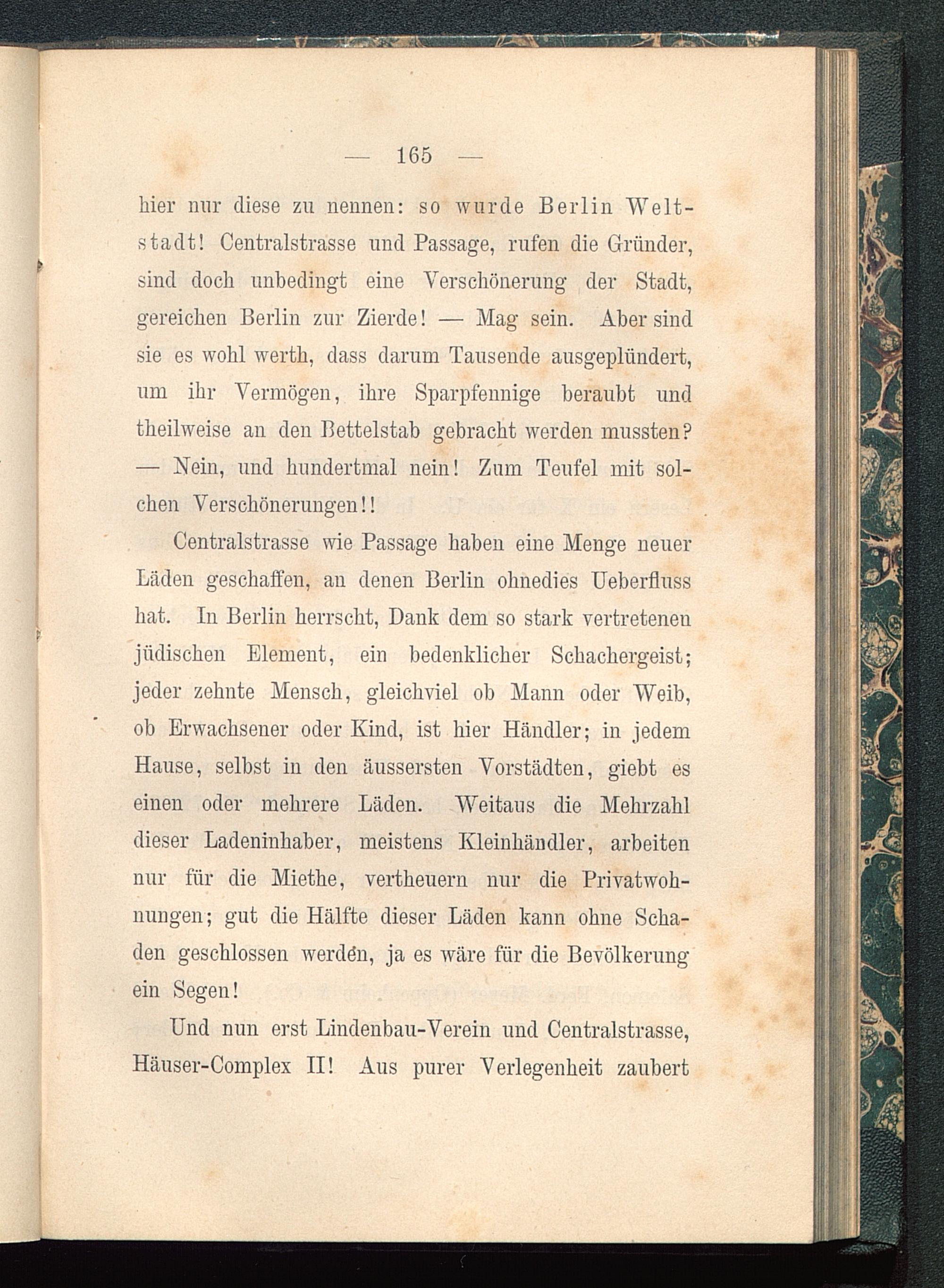 hier mir diese zu nennen: so wurde Berlin Welt-stadt! Centralstrasse und Passage, rufen die Gründer,sind doch unbedingt eine Verschönerung der Stadt,gereichen Berlin zur Zierde! — Mag sein. Aber sindsie es wohl werth, dass darum Tausende ausgeplündert,um ihr Vermögen, ihre Sparpfennige beraubt undtheilweise an den Bettelstab gebracht werden mussten?— Nein, und hundertmal nein! Zum Teufel mit sol-chen V erschöneruiigen!!