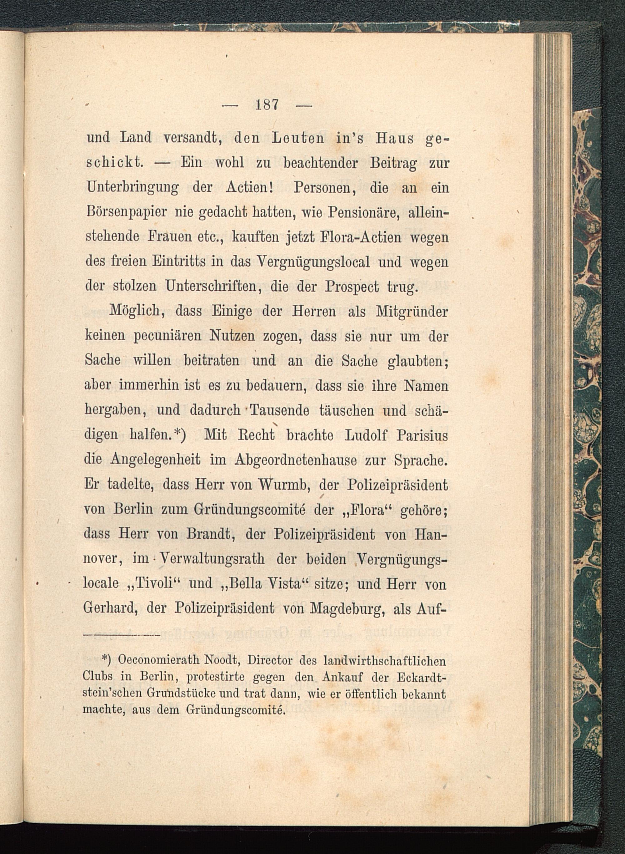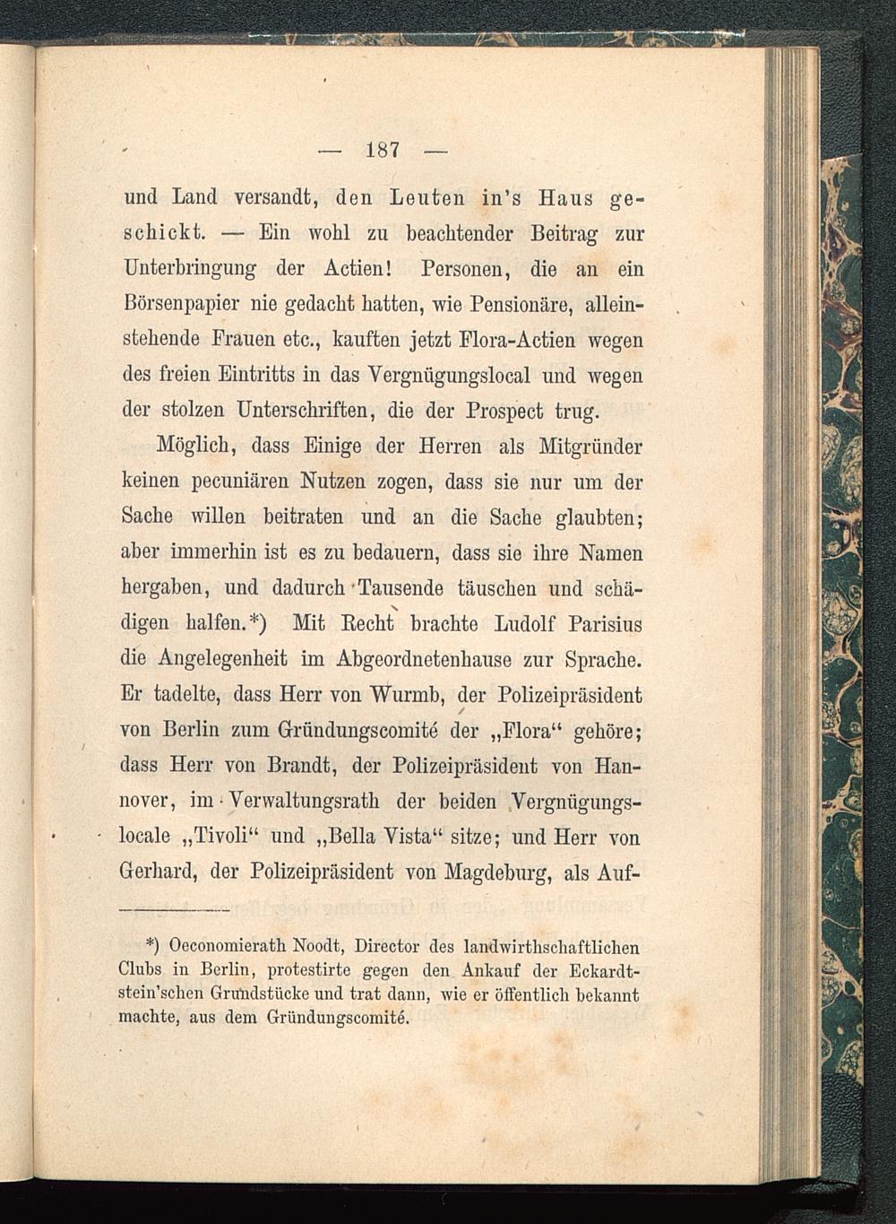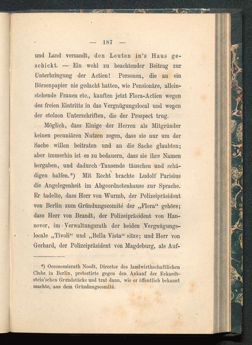 digen halfen.*) Mit Recht brachte Ludolf Parisius die Angelegenheit im Abgeordnetenhause zur Sprache.Er tadelte, dass Herr von Wurmb, der Polizeipräsidentvon Berlin zum Gründungscomite der „Flora“ gehöre;dass Herr von Brandt, der Polizeipräsident von Han-nover , im • Verwaltungsrath der beiden Vergnügungs-locale „Tivoli“ und „Bella Vista“ sitze; und Herr vonGerhard, der Polizeipräsident von Magdeburg , als Auf-