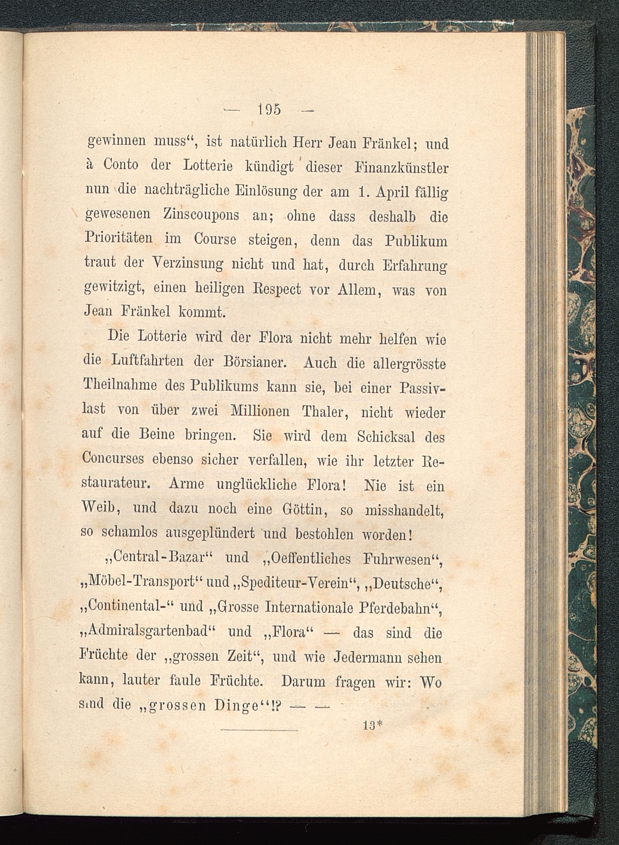 gewinnen muss“, ist natürlich Herr Jean Frankel; unda Conto der Lotterie kündigt dieser Finanzkünstlernun die nachträgliche Einlösung der am 1. April fälliggewesenen Zinscoupons an; ohne dass deshalb diePrioritäten im Course steigen, denn das Publikumtraut der Verzinsung nicht und hat, durch Erfahrunggewitzigt, einen heiligen Iiespect vor Allem, was vonJean Fränkel kommt.