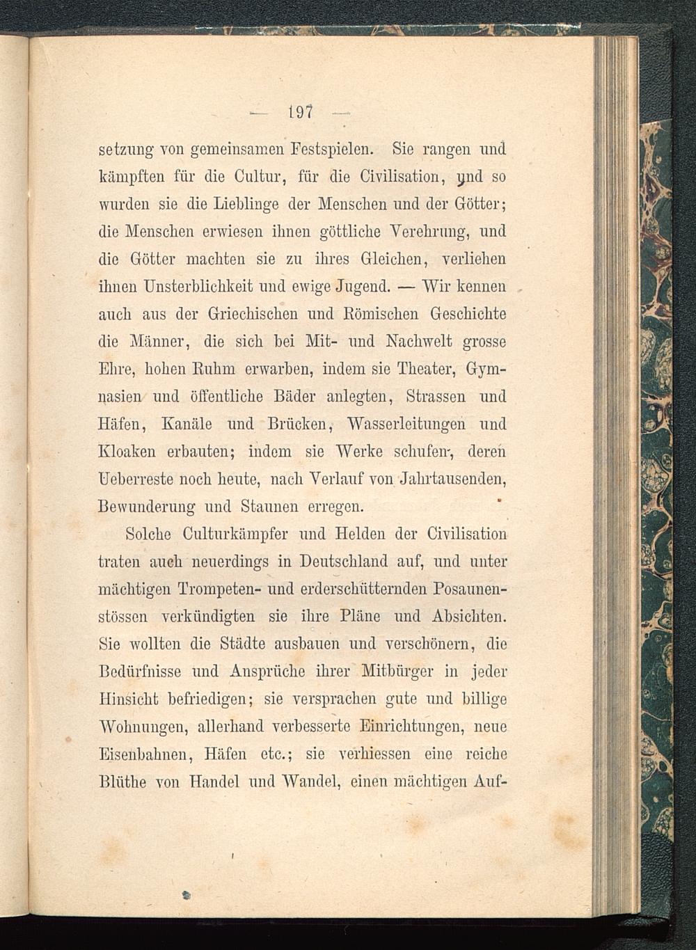 Solche Culturkämpfer und Helden der Civilisationtraten auch neuerdings in Deutschland auf, und untermächtigen Trompeten- und erderschütternden Posaunen-stösson verkündigten sie ihre Pläne und Absichten.Sie wollten die Städte ausbauen und verschönern, dieBedürfnisse und Ansprüche ihrer Mitbürger in jederHinsicht befriedigen; sie versprachen gute und billigeWohnungen, allerhand verbesserte Einrichtungen, neueEisenbahnen, Häfen etc.; sie verhiessen eine reicheBlüthe von Handel und Wandel, einen mächtigen Auf-