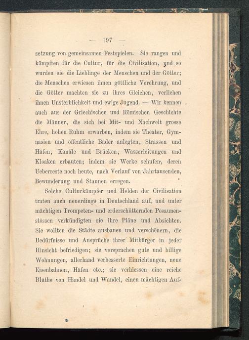 Setzung von gemeinsamen Festspielen. Sie rangen undkämpften für die Cultur, für die Civilisation, ynd sowurden sie die Lieblinge der Menschen und der Götter;die Menschen erwiesen ihnen göttliche Verehrung, unddie Götter machten sie zu ihres Gleichen, verliehenihnen Unsterblichkeit und ewige Jugend. — Wir kennenauch aus der Griechischen und Römischen Geschichtedie Männer, die sich bei Mit- und Nachwelt grosseEhre, hohen Ruhm erwarben, indem sie Theater, Gym-nasien und öffentliche Bäder anlegten, Strassen undHäfen, Kanäle und Brücken, Wasserleitungen undKloaken erbauten; indem sie Werke schufen-, derenUeberreste noch heute, nach Verlauf von Jahrtausenden,Bewunderung und Staunen erregen.