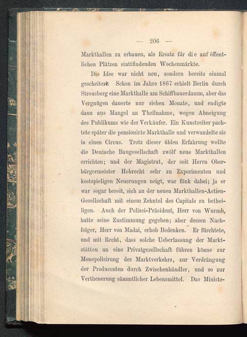 Die Idee war nicht neu, sondern bereits einmalgescheiter#. Schon im Jahre 1867 erhielt Berlin durchStrousberg eine Markthalle am Schiffbauerdamm, aber dasVergnügen dauerte nur sieben Monate, und endigtedann aus Mangel an Theilnahme, wegen Abneigungdes Publikums wie der Verkäufer. Ein Kunstreiter pach-tete später die pensionirte Markthalle und verwandelte siein einen Circus. Trotz dieser üblen Erfahrung wolltedie Deutsche Baugesellschaft zwölf neue Markthallenerrichten; und der Magistrat, der seit Herrn Ober-bürgermeister Ilobrecht sehr zu Experimenten undkostspieligen Neuerungen neigt, war flink dabei; ja erwar sogar bereit, sich an der neuen Markthallen-Actien-Gesellschaft mit einem Zehntel des Capitals zu bethei-ligen. Auch der Polizei-Präsident, Herr von Wurmb,hatte seine Zustimmung gegeben; aber dessen Nach-folger, Herr von Madai, erhob Bedenken. Er fürchtete,und mit Recht, dass solche Ueberlassung der Markt-stätten an eine Privatgesellschaft führen könne zurMonopolisirung des Marktverkehrs, zur Verdrängungder Producenten durch Zwischenhändler, und so zurVertheuerung sämmtlicher Lebensmittel. Das Ministe-
