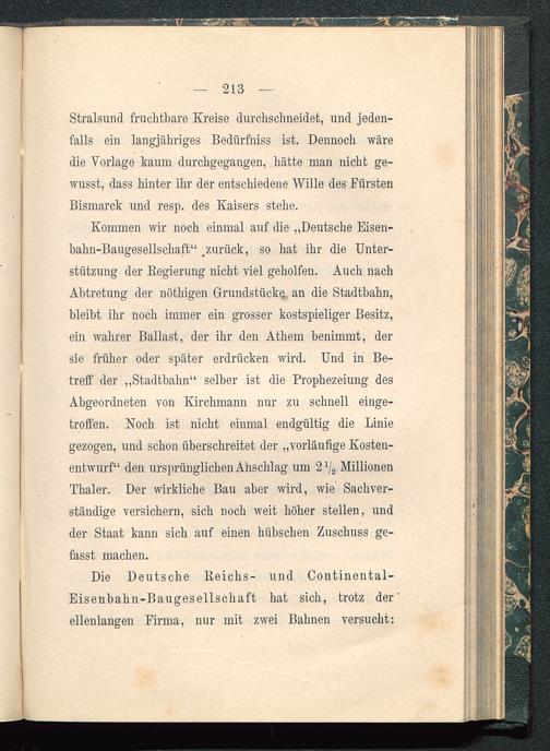 Stralsund fruchtbare Kreise durchschneidet, und jeden-falls ein langjähriges Bedürfnis ist. Dennoch wäredie Vorlage kaum durchgegangen, hätte man nicht ge-wusst, dass hinter ihr der entschiedene Wille des FürstenBismarck und resp. des Kaisers stehe.