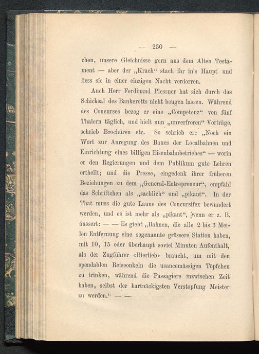 Audi Herr Ferdinand Plessner hat sich durch dasSchicksal des Bankerotts nicht beugen lassen. Währenddes Concurses bezog er eine „Competenz“ von fünfThalern täglich, und hielt nun „unverfroren“ Vorträge,schrieb Brochüren etc. So schrieb er: „Noch einWort zur Anregung des Baues der Localbahnen undEinrichtung eines billigen Eisenbahnbetriebes“ — woriner den Regierungen und dem Publikum gute Lehrenertheilt; und die Presse, eingedenk ihrer früherenBeziehungen zu dem „General-Entrepreneur“, empfahldas Sckriftchen als „sachlich“ und „pikant“. In derThat muss die gute Laune des Concursifex bewundertwerden, und es ist mehr als „pikant“, jwenn er z. B.äussert:-Es giebt „Bahnen, die alle 2 bis 3 Mei-