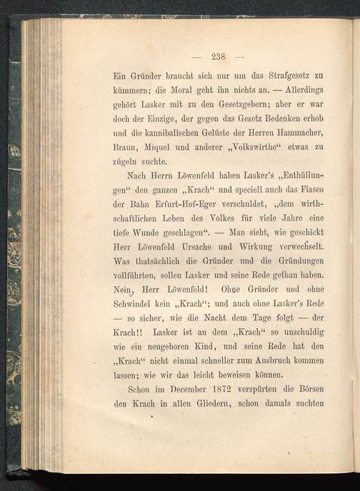 Nach Herrn Löwenfeld haben Lasker’s „Enthüllun-gen“ den ganzen „Krach“ und speciell auch das Fiascoder Bahn Erfurt-Hof-Eger verschuldet, „dem wirtli-schaftlichen Leben des Volkes für viele Jahre einetiefe Wunde geschlagen“. — Man sieht, wie geschicktHerr Löwenfeld Ursache und Wirkung verwechselt.Was thatsächlich die Gründer und die Gründungenvollführten, sollen Lasker und seine Rede gethan haben.Nein, Herr Löwenfeld! Ohpe Gründer und ohneSchwindel kein „Krach“; und auch ohne Lasker’s Rede— so sicher, wie die Nacht dem Tage folgt — derKrach!! Lasker ist an dem „Krach“ so unschuldigwie ein neugeboren Kind, und seine Rede hat den„Krach“ nicht einmal schneller zum Ausbruch kommenlassen; wie wir das leicht beweisen können.