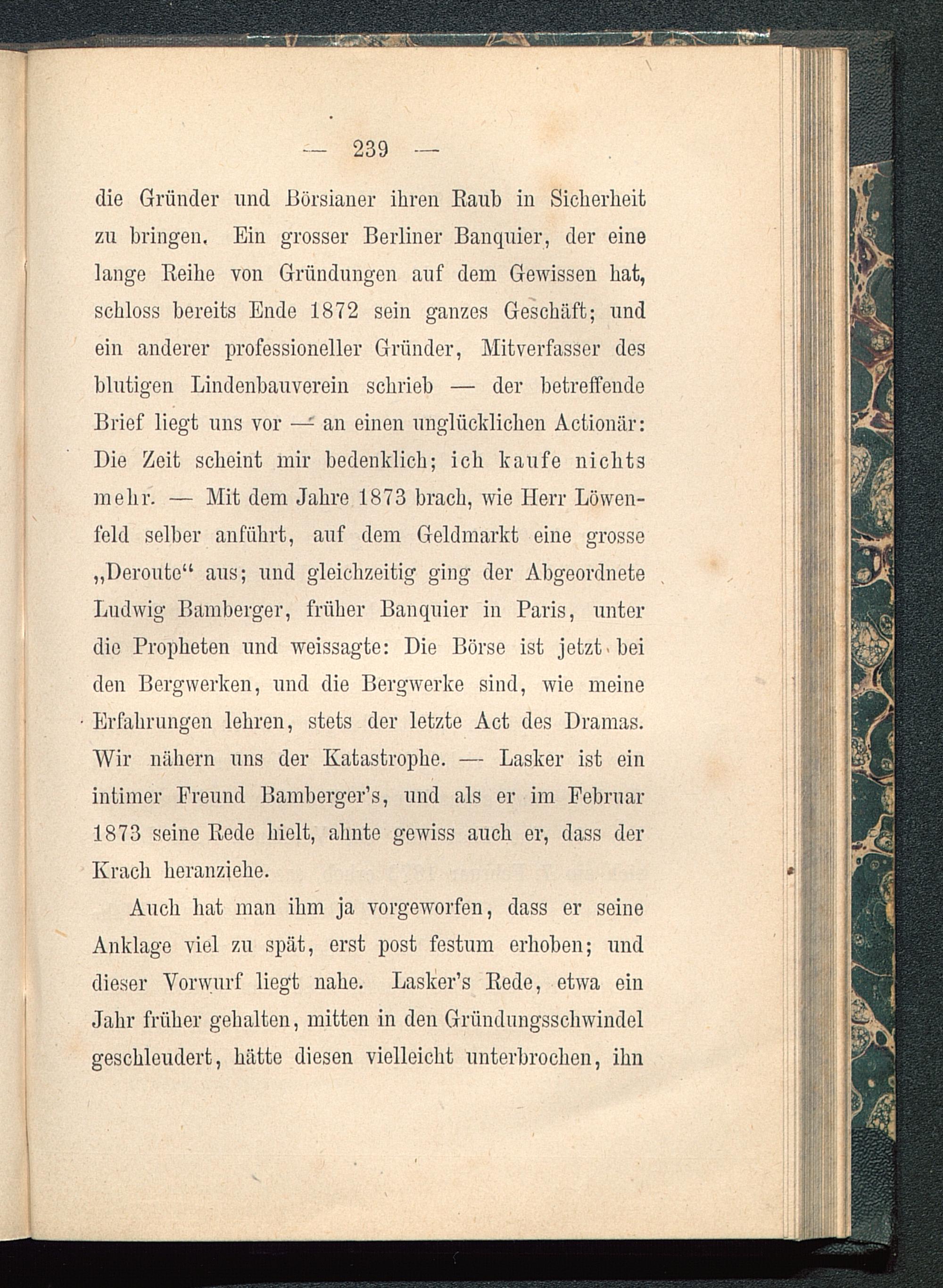 Auch hat man ihm ja vorgeworfen, dass er seineAnklage viel zu spät, erst post festum erhoben; unddieser Vorwurf liegt nahe. Lasker’s Rede, etwa einJahr früher gehalten, mitten in den Gründungsschwindelgeschleudert, hätte diesen vielleicht unterbrochen, ihn