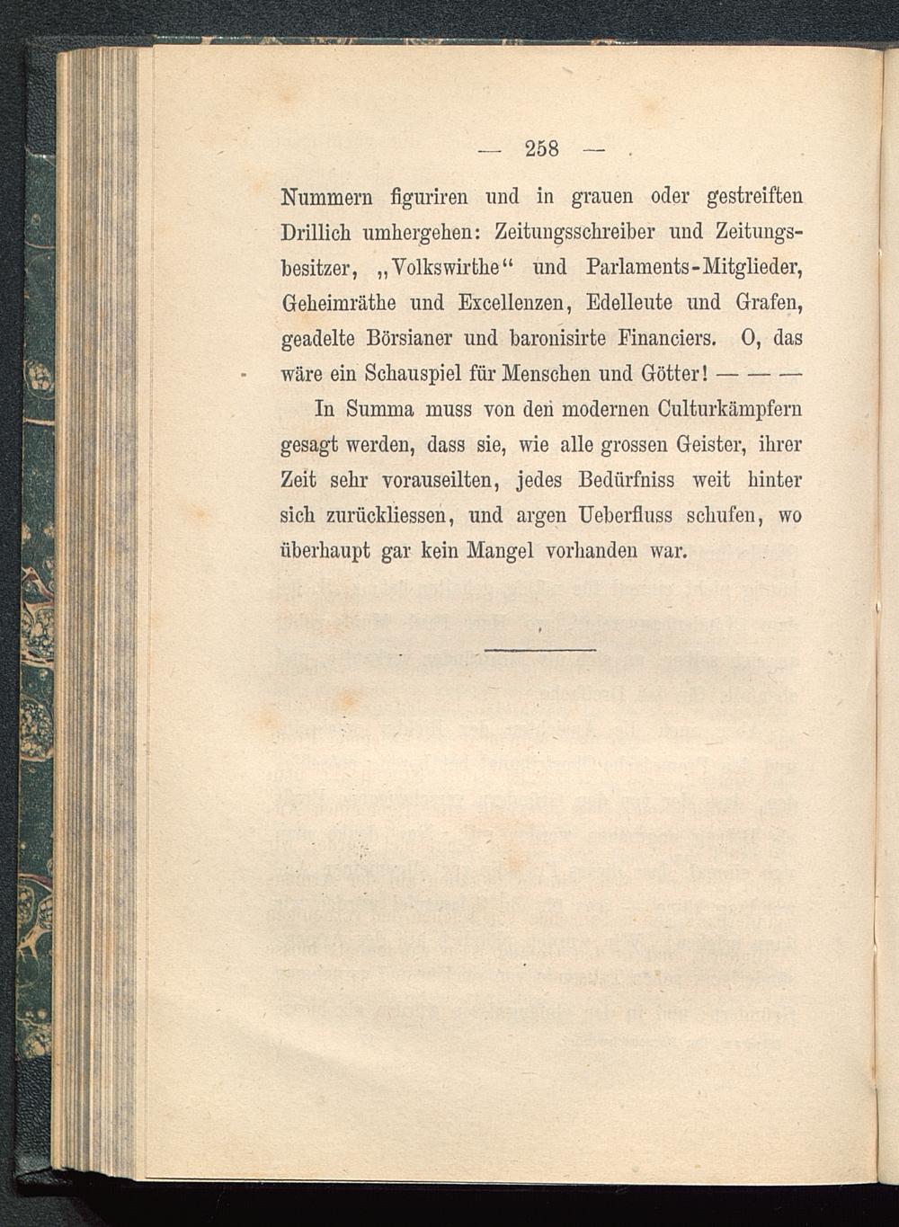 In Summa muss von den modernen Culturkämpferngesagt werden, dass sie, wie alle grossen Geister, ihrerZeit sehr vorauseilten, jedes Bediirfniss weit hintersich zurückliessen, und argen Ueberfluss schufen, woüberhaupt gar kein Mangel vorhanden war.