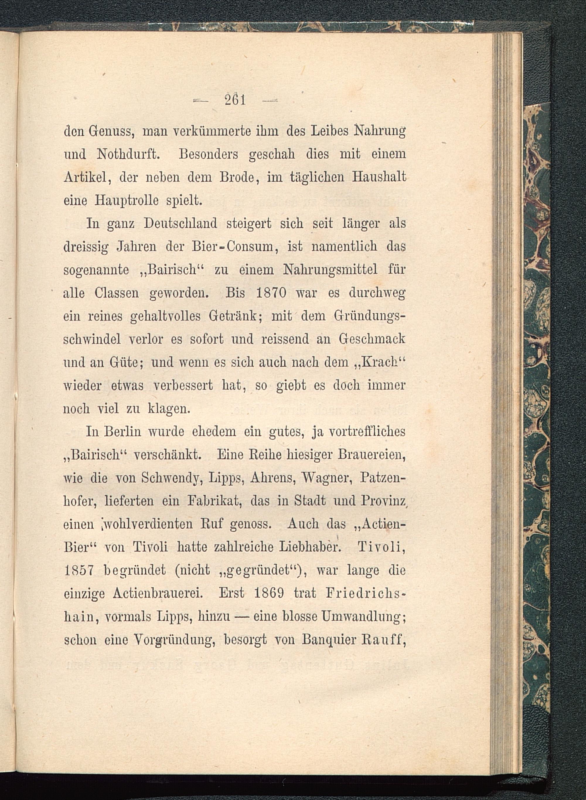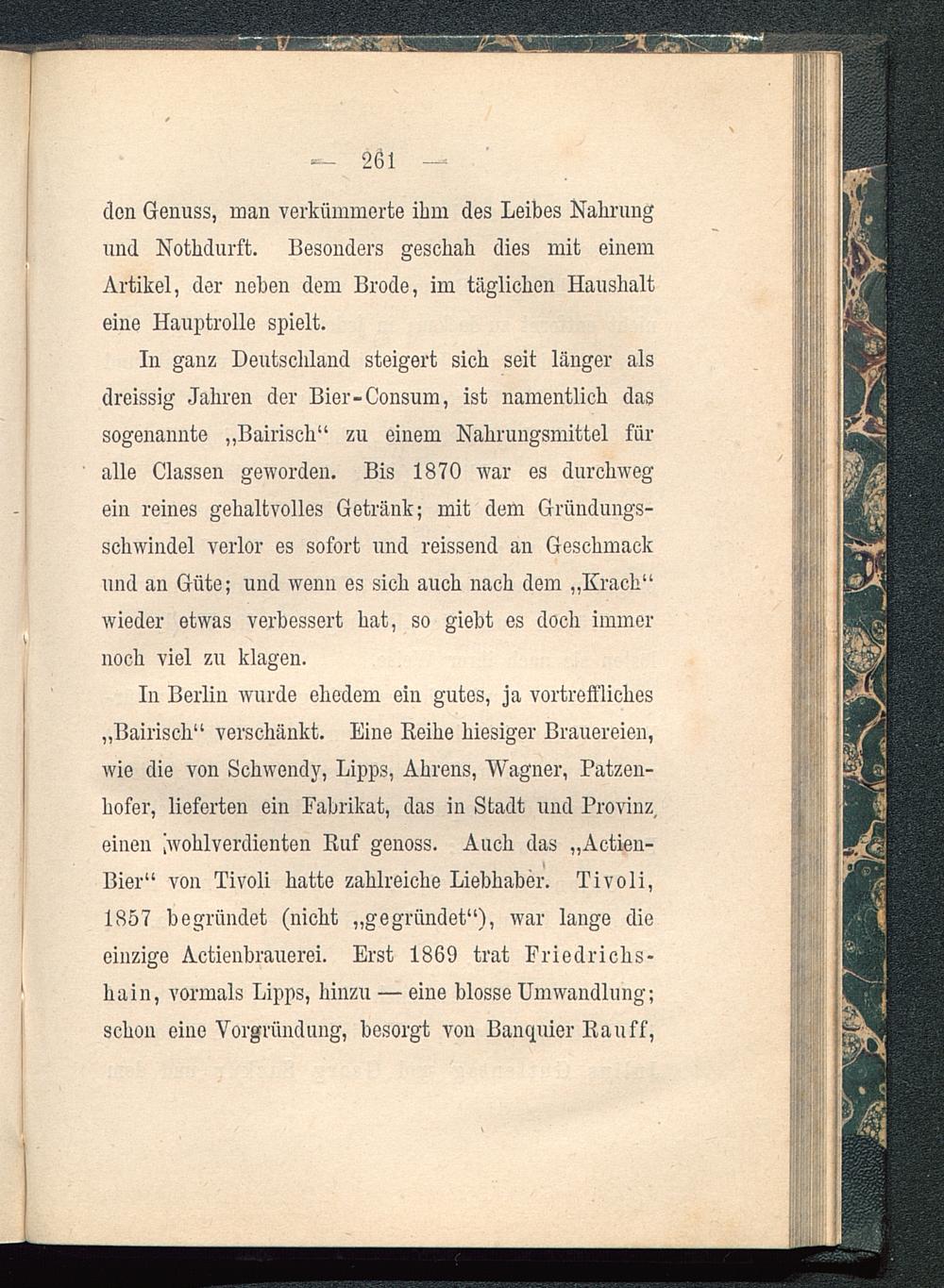 In Berlin wurde ehedem ein gutes, ja vortreffliches„Bairisch “ verschänkt. Eine Reihe hiesiger Brauereien,wie die von Schwendy, Lipps, Ahrens, Wagner, Patzen-hofer, lieferten ein Fabrikat, das in Stadt und Provinzeinen [wohlverdienten Ruf genoss. Auch das „Actien-