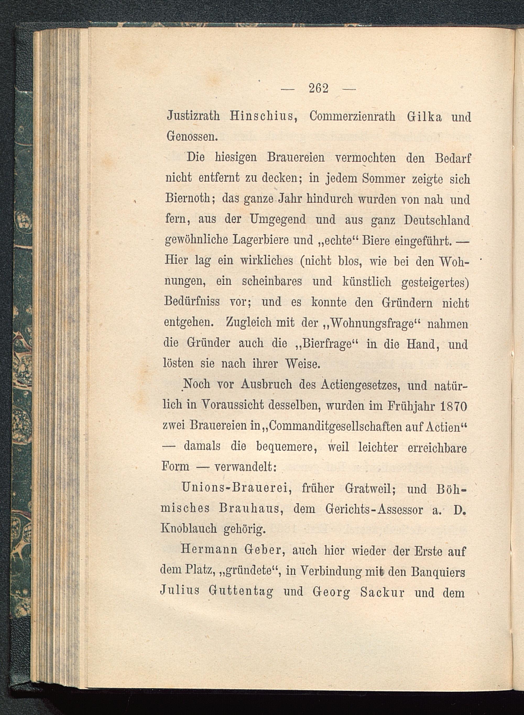 Die hiesigen Brauereien vermochten den Bedarfnicht entfernt zu decken; in jedem Sommer zeigte sichBiernoth; das ganze Jahr hindurch wurden von nah undfern, aus der Umgegend und aus ganz Deutschland gewöhnliche Lagerbiere und „echte“ Biere eingeführt. —Hier lag ein wirkliches (nicht blos, wie bei den Woh-nungen, ein scheinbares und künstlich gesteigertes)Bedürfnis vor; und es konnte den Gründern nichtentgehen. Zugleich mit der „Wohnungsfrage“ nahmendie Gründer auch die „Bierfrage“ in die Hand, undlösten sie nach ihrer Weise.