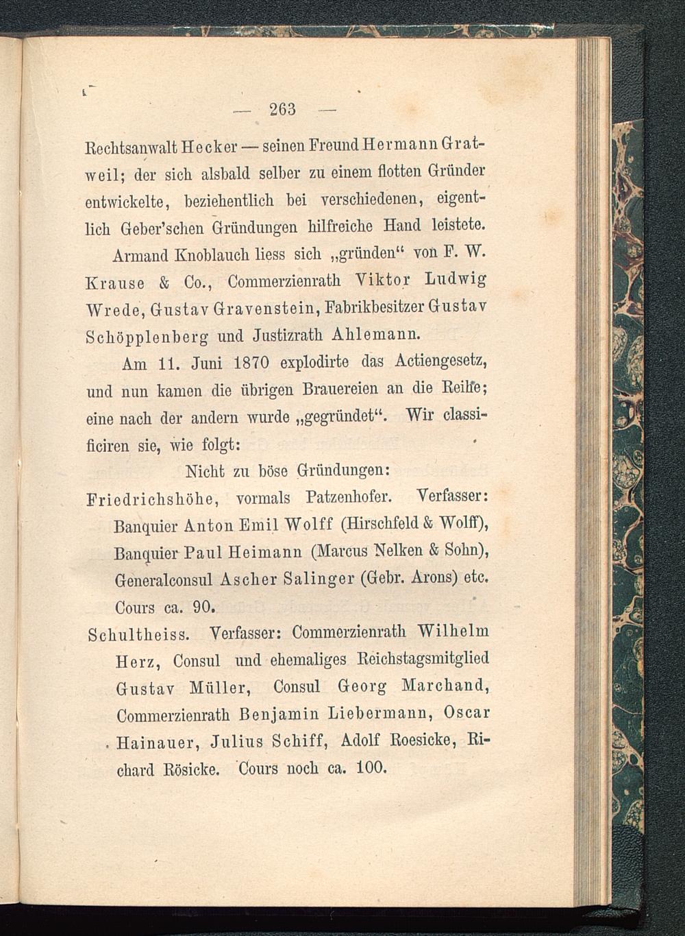 Schultheiss. Verfasser: Commerzienrath WilhelmHerz, Consul und ehemaliges ReichstagsmitgliedGustav Müller, Consul Georg Marchand,Commerzienrath Benjamin Liebermann, Oscar. Hainauer, Julius Schiff, Adolf Roesicke, Ri-chard Rösicke . Cours noch ca. 100.