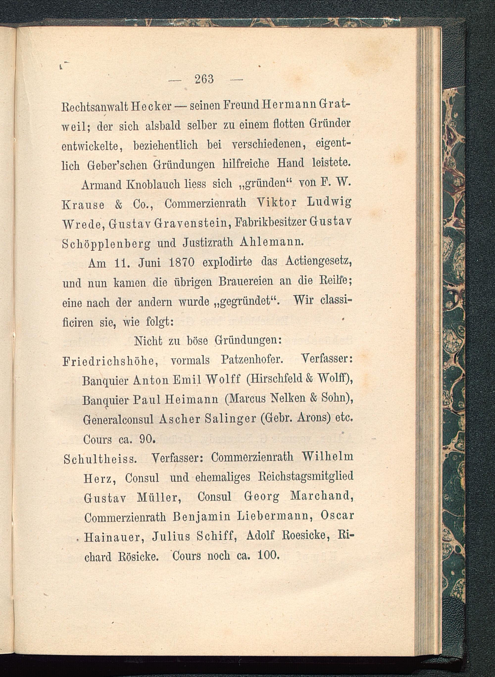 Nicht zu böse Gründungen:Friedrichshöhe, vormals Patzenhofer. Verfasser:Banquier Anton Emil Wolff (Hirschfeld & Wolff),Banquier Paul Heimann (Marcus Nelken & Sohn),Generalconsul Ascher Salinger (Gehr. Arons) etc.Cours ca. 90.