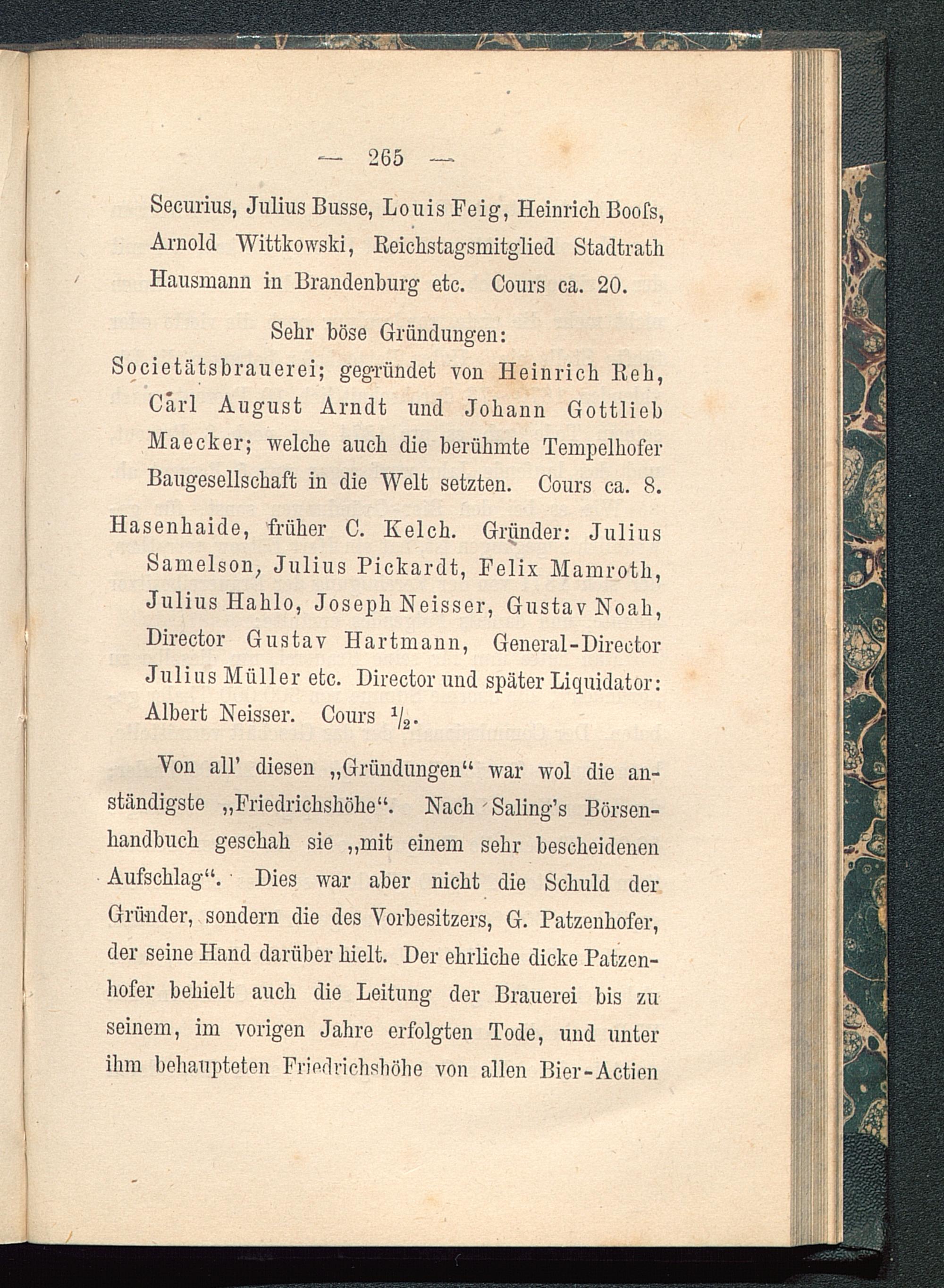 Ton all’ diesen „Gründungen“ war wol die an-ständigste „Friedrichshöhe“. Nach ' Saling’s Börsen-handbuch geschah sie „mit einem sehr bescheidenenAufschlag“. Dies war aber nicht die Schuld derGründer, sondern die des Vorbesitzers, G. Patzenhofer,der seine Hand darüber hielt. Der ehrliche dicke Patzon-liofer behielt auch die Leitung der Brauerei bis zuseinem, im vorigen Jahre erfolgten Tode, und unterihm behaupteten Friedrichshöhe von allen Bier-Actien