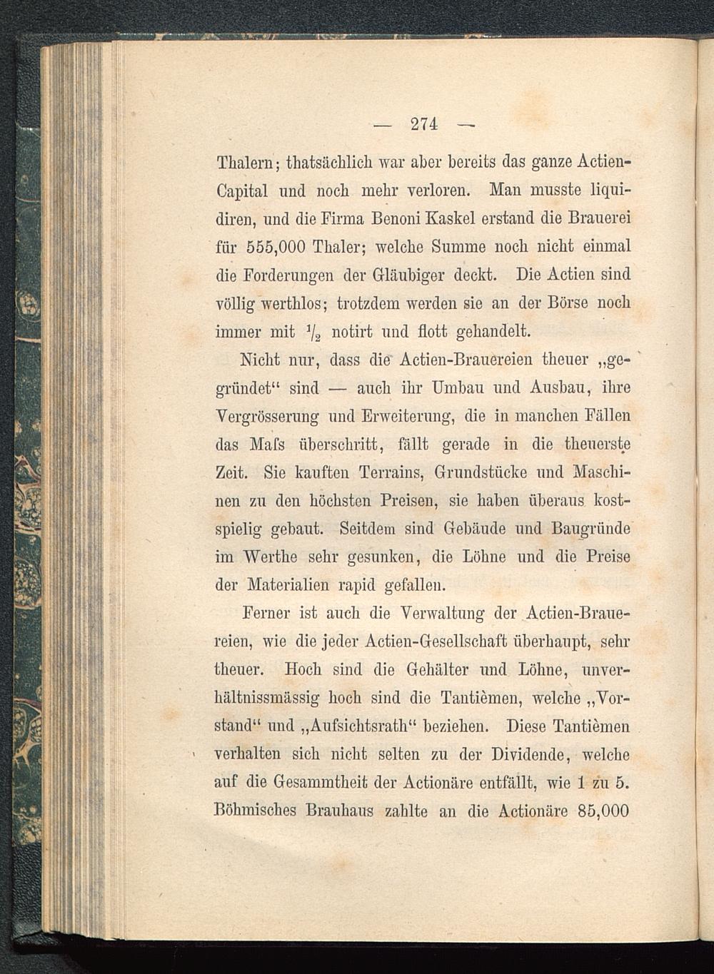 Ferner ist auch die Verwaltung der Actien-Braue-reien, wie die jeder Actien-Gesellschaft überhaupt, sehrtheuer. Hoch sind die Gehälter und Löhne, unver-hältnissmässig hoch sind die Tantiemen, welche „Vor-stand“ und „Aufsichtsrath“ beziehen. Diese Tantiemenverhalten sich nicht selten zu der Dividende, welcheauf die Gesammtheit der Actionäre entfällt, wie 1 zu 5.Böhmisches Brauhaus zahlte an die Actionäre 85,000