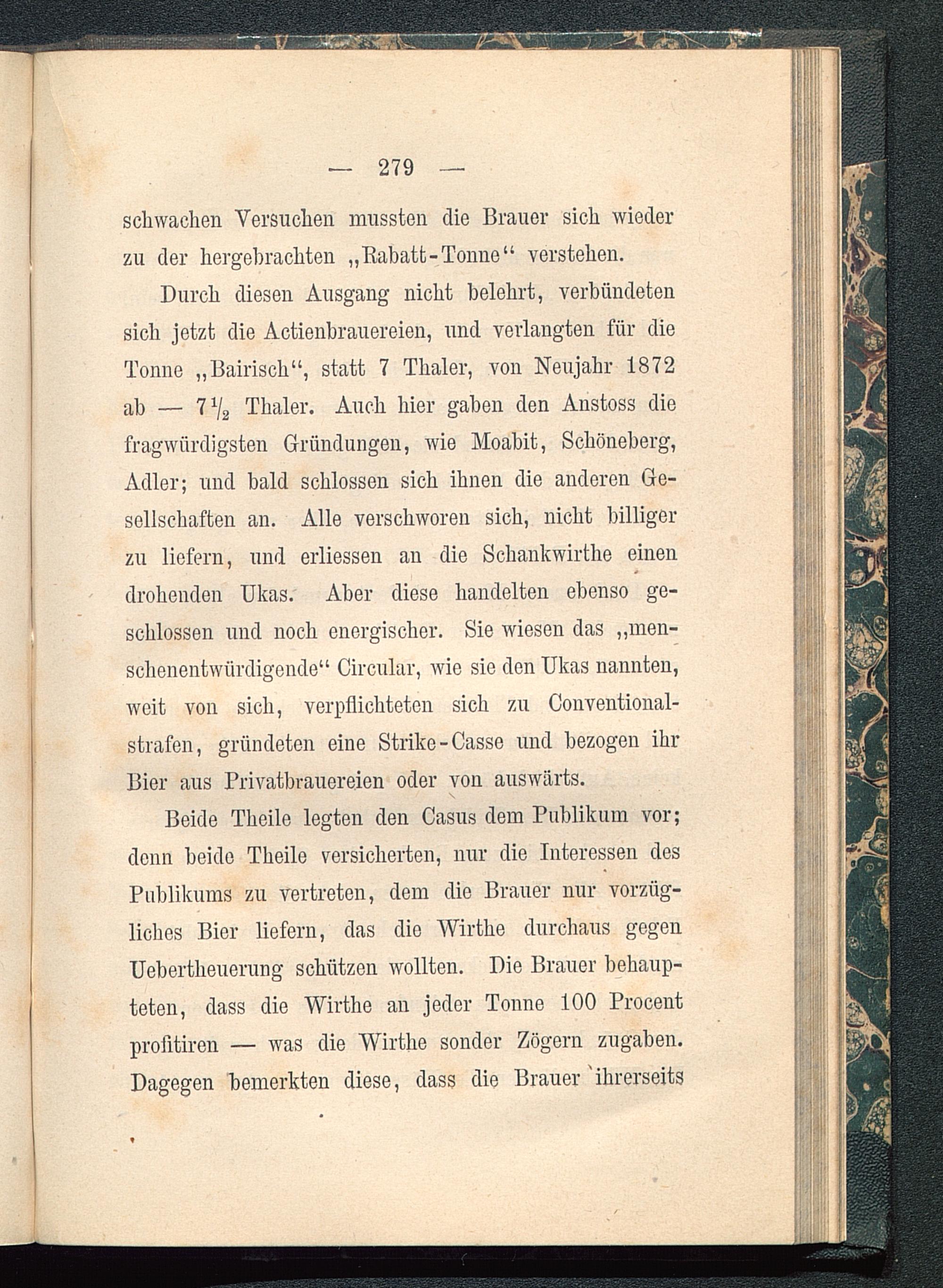 Durch diesen Ausgang nicht belehrt, verbündetensich jetzt die Actienbrauereien, und verlangten für dieTonne „Bairisch “, statt 7 Thaler, von Neujahr 1872ab — 1 % Thaler. Auch hier gaben den Anstoss diefragwürdigsten Gründungen, wie Moabit, Schöneberg, Adler; und bald schlossen sich ihnen die anderen Ge-sellschaften an. Alle verschworen sich, nicht billigerzu liefern, und erliessen au die Schankwirthe einendrohenden Ukas. Aber diese handelten ebenso ge-schlossen und noch energischer. Sie wiesen das „men-schenentwürdigende“ Circular, wie sie den Ukas nannten,weit von sich, verpflichteten sich zu Conventionai-strafen, gründeten eine Strike-Casse und bezogen ihrBier aus Privatbrauereien oder von auswärts.